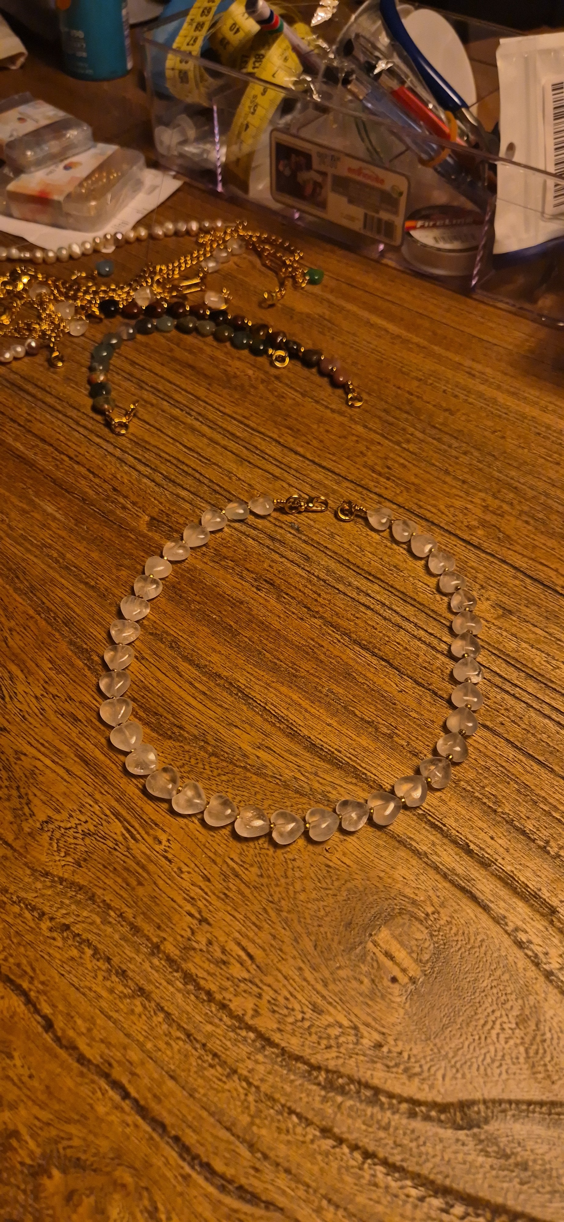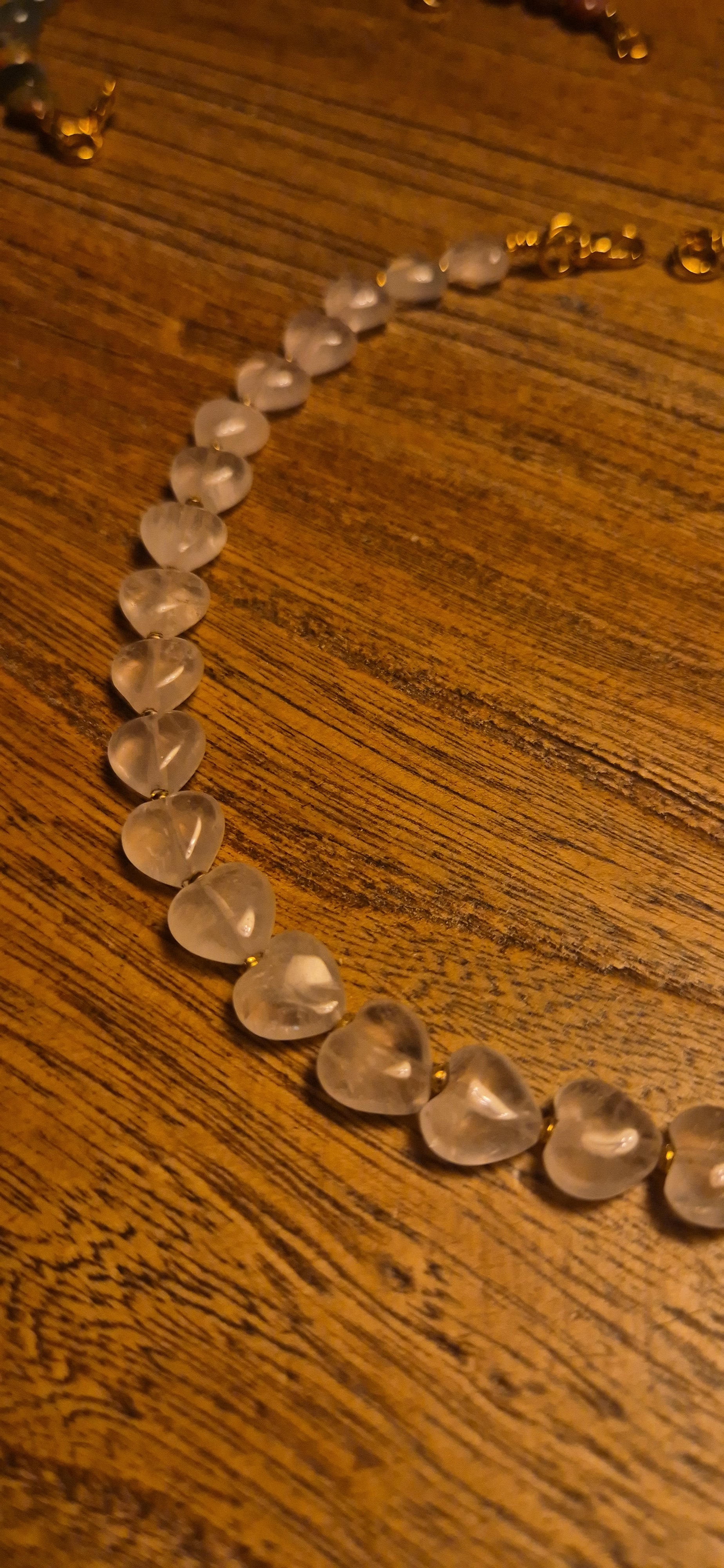 שרשרת אבני קווארץ לבבות בצבע ורוד בהיר שקוף, אורך השרשרת 44 ס"מ