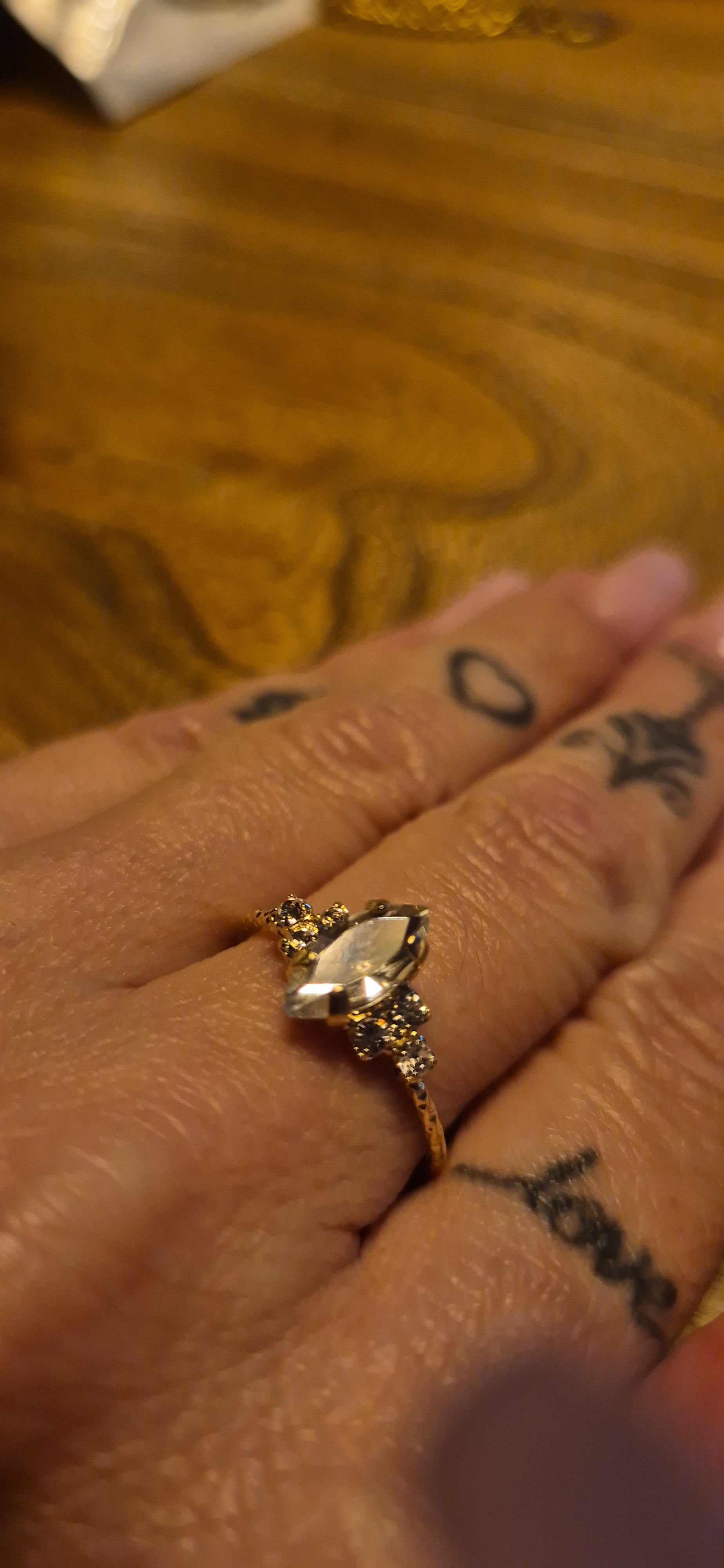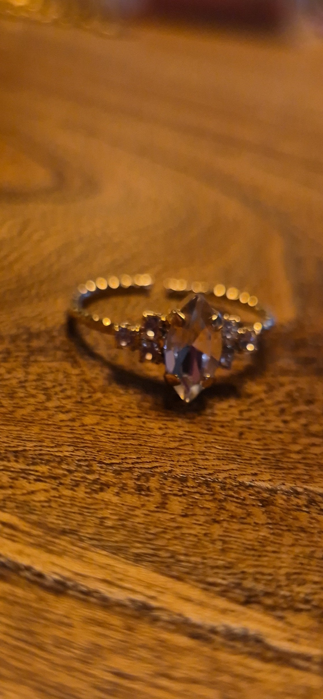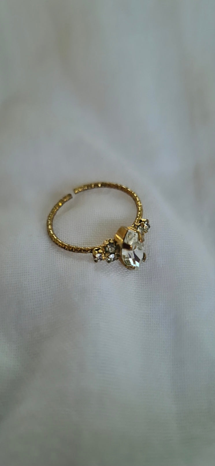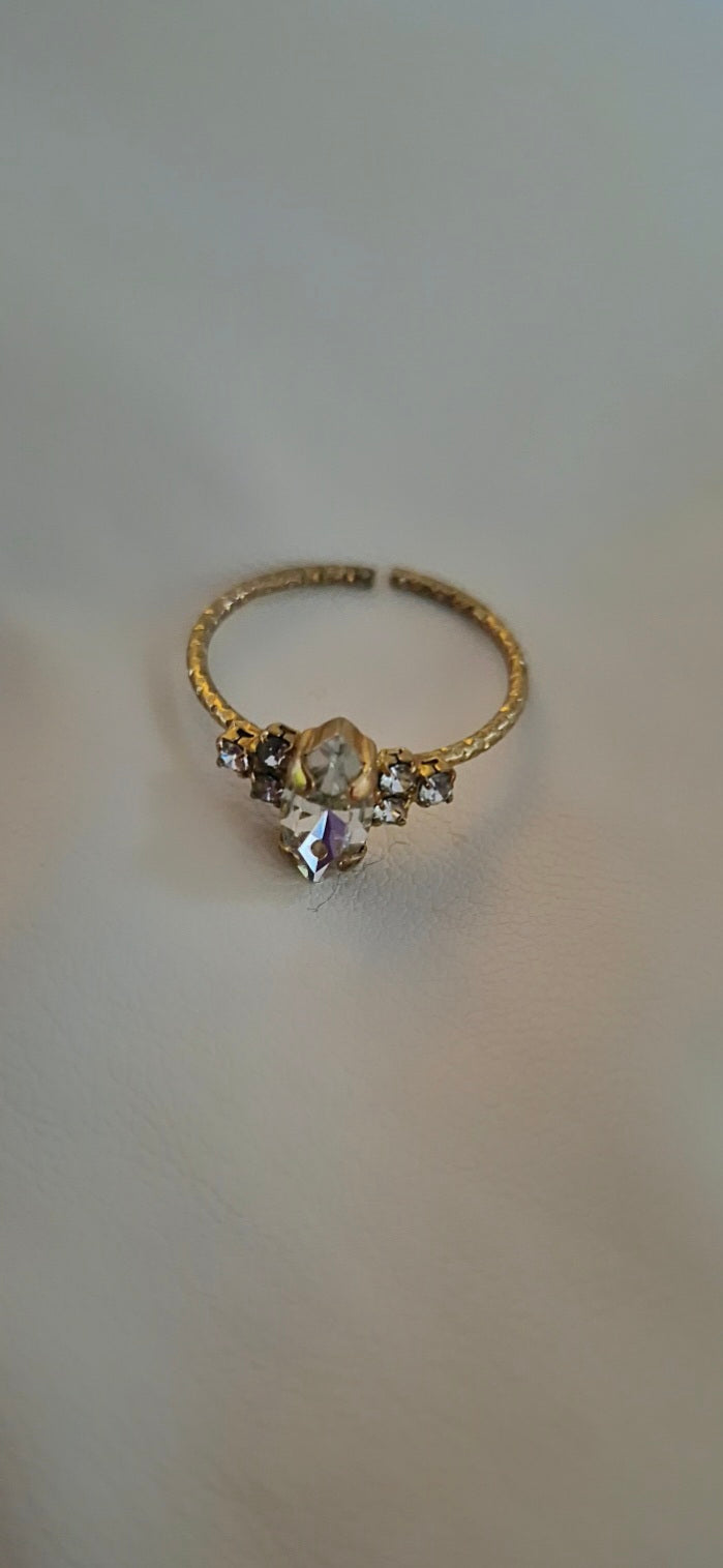 טבעת משובצת אבן קריסטל סירה קטנה 10 על 5 מ"מ במרכז וזרקונים קטנים בצדדים, ציפוי זהב, הטבעת פתוחה בחלקה האחורי וניתן להתאים את המידה שלה לאצבע