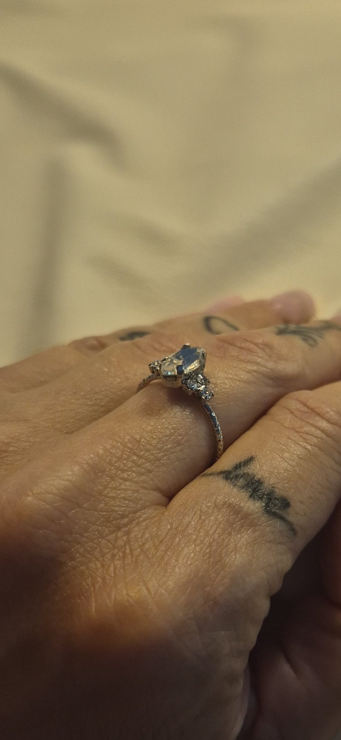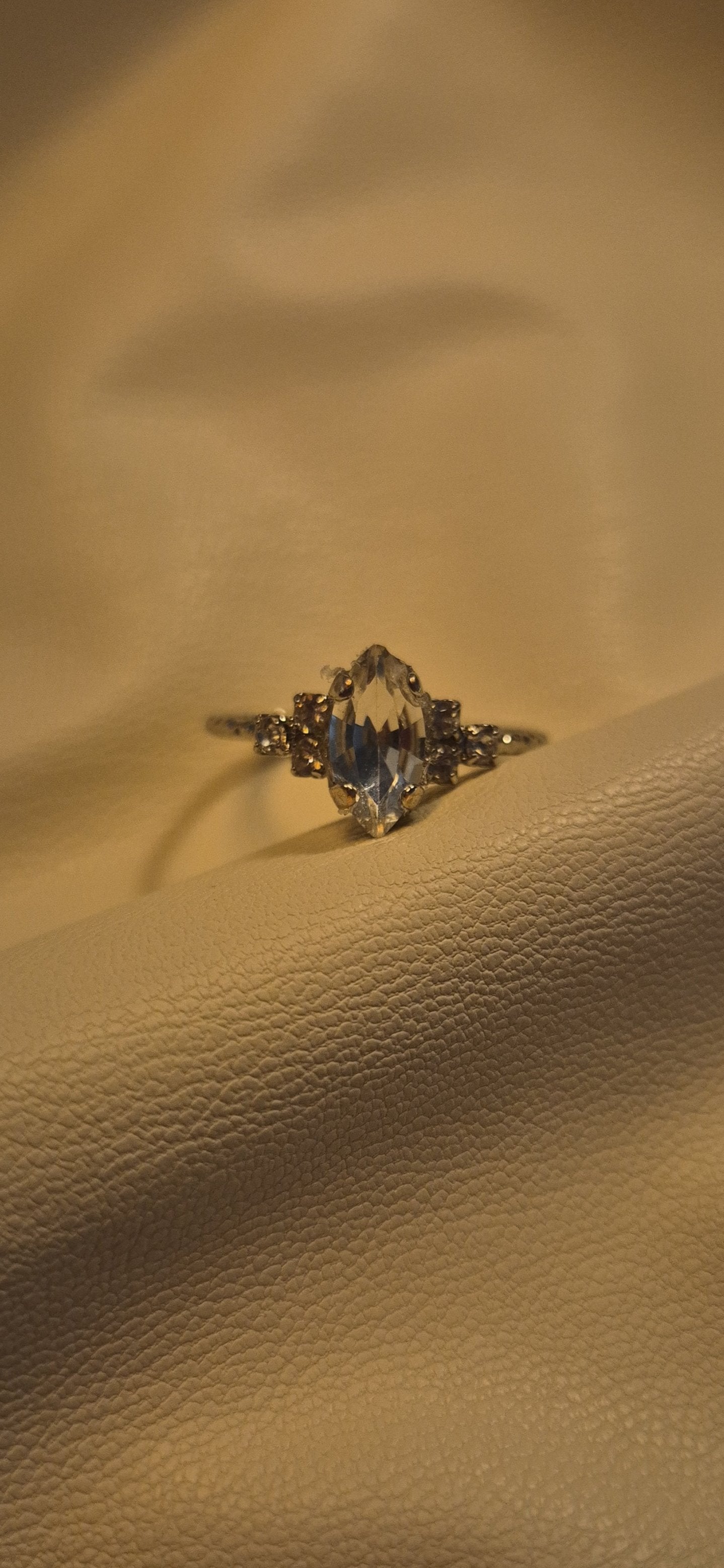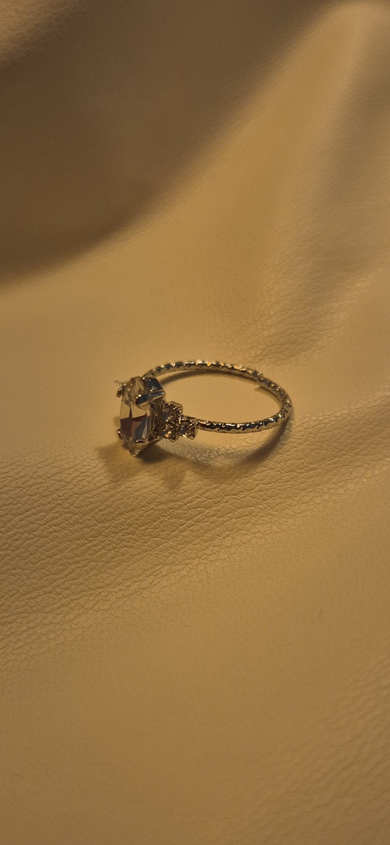 טבעת משובצת אבן קריסטל סירה קטנה 10 על 5 מ"מ במרכז וזרקונים קטנים בצדדים, צבע כסף, הטבעת פתוחה בחלקה האחורי וניתן להתאים את המידה שלה לאצבע