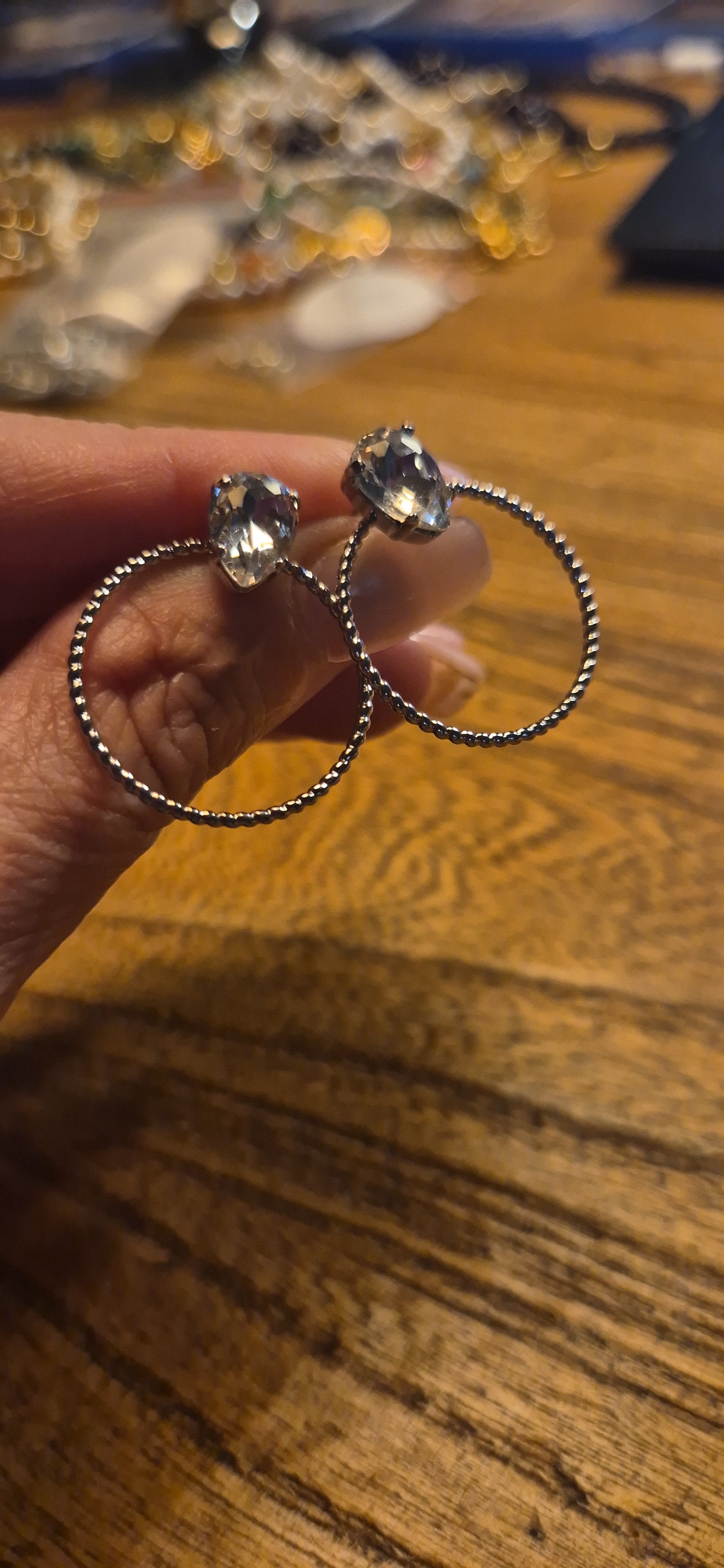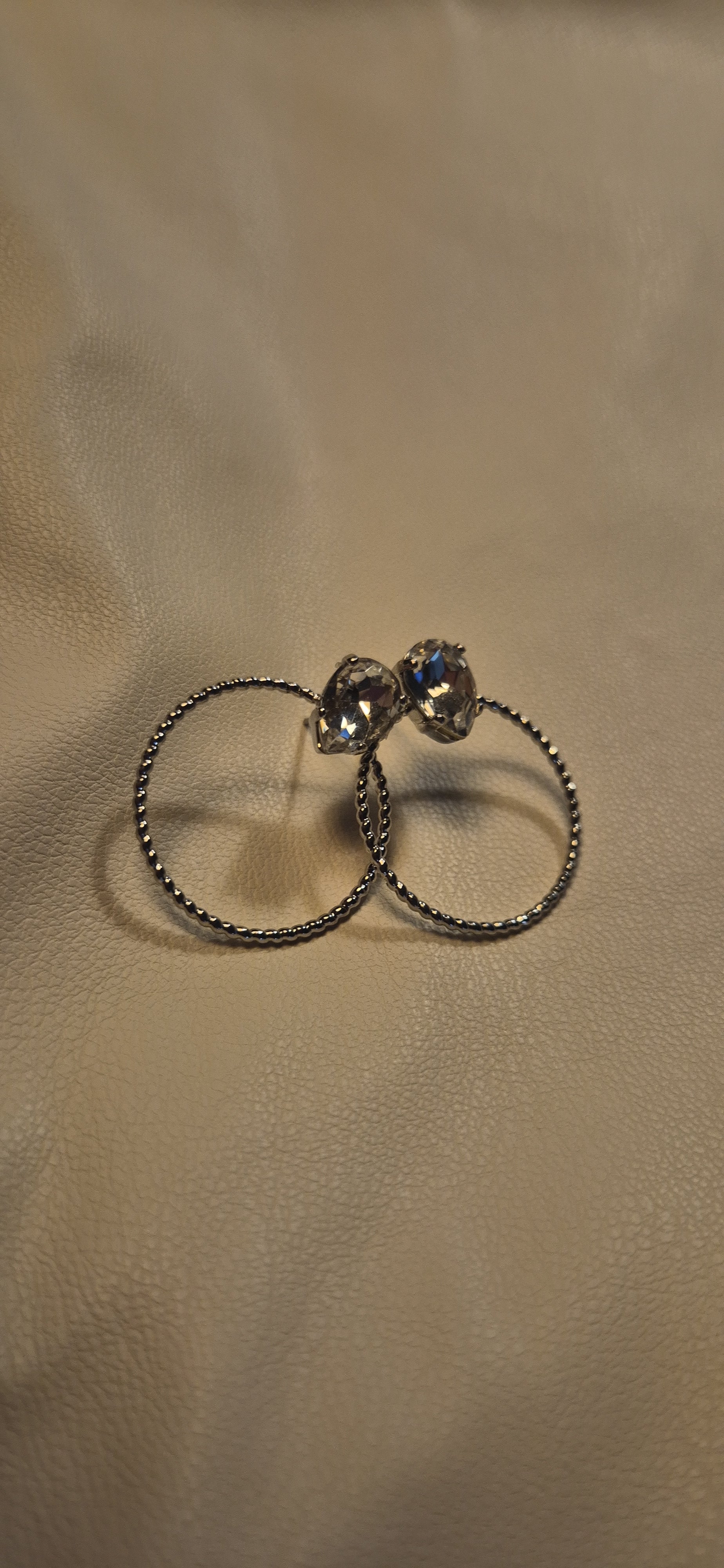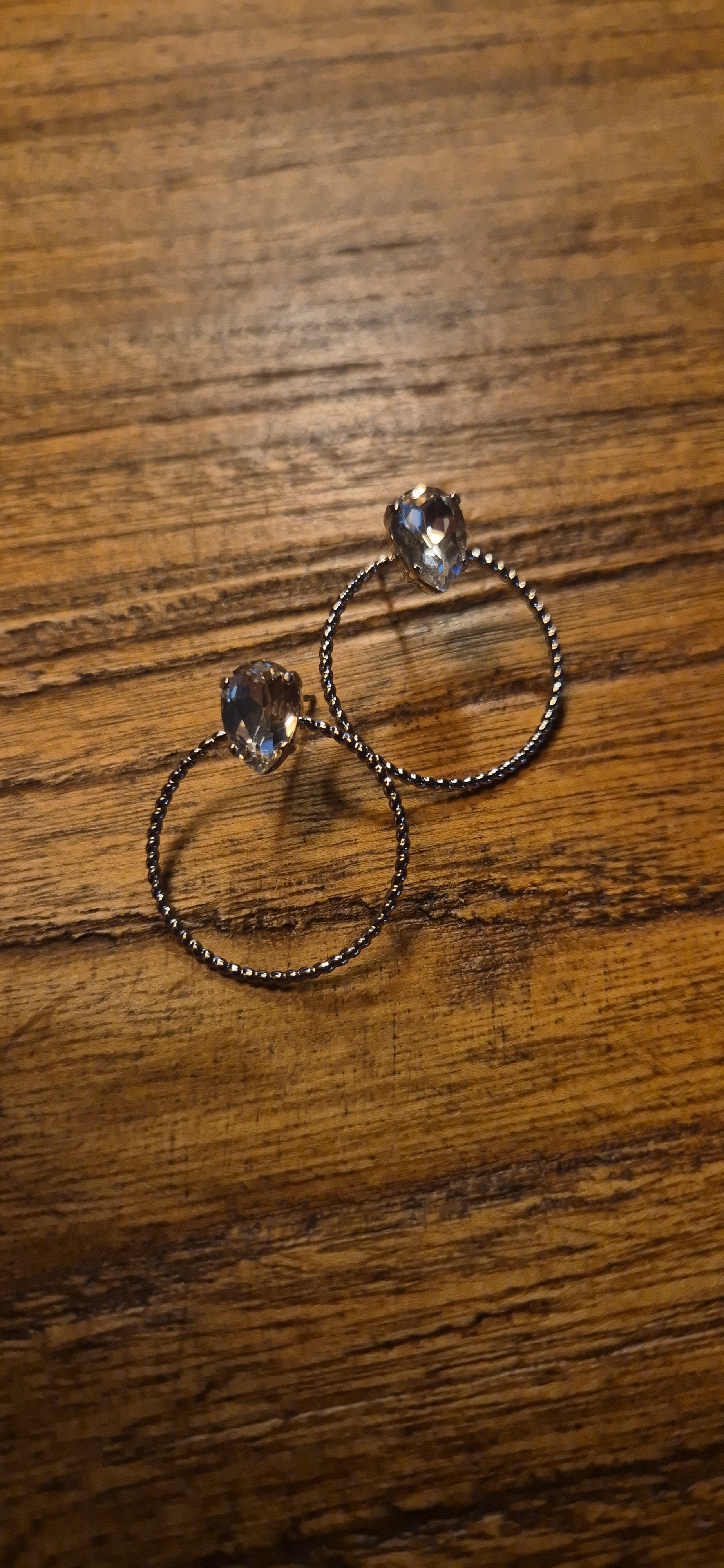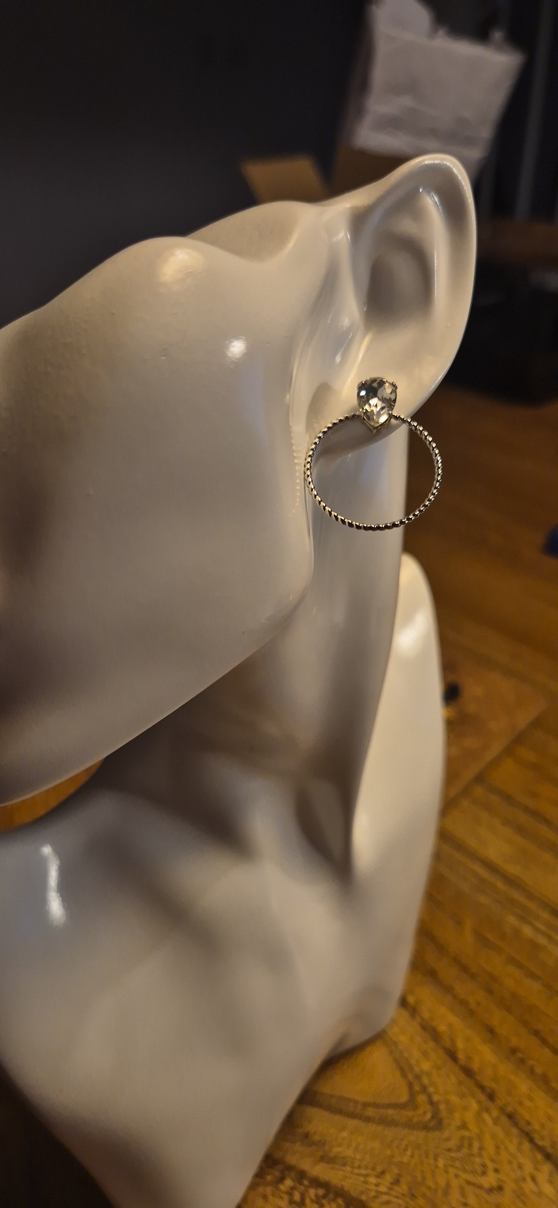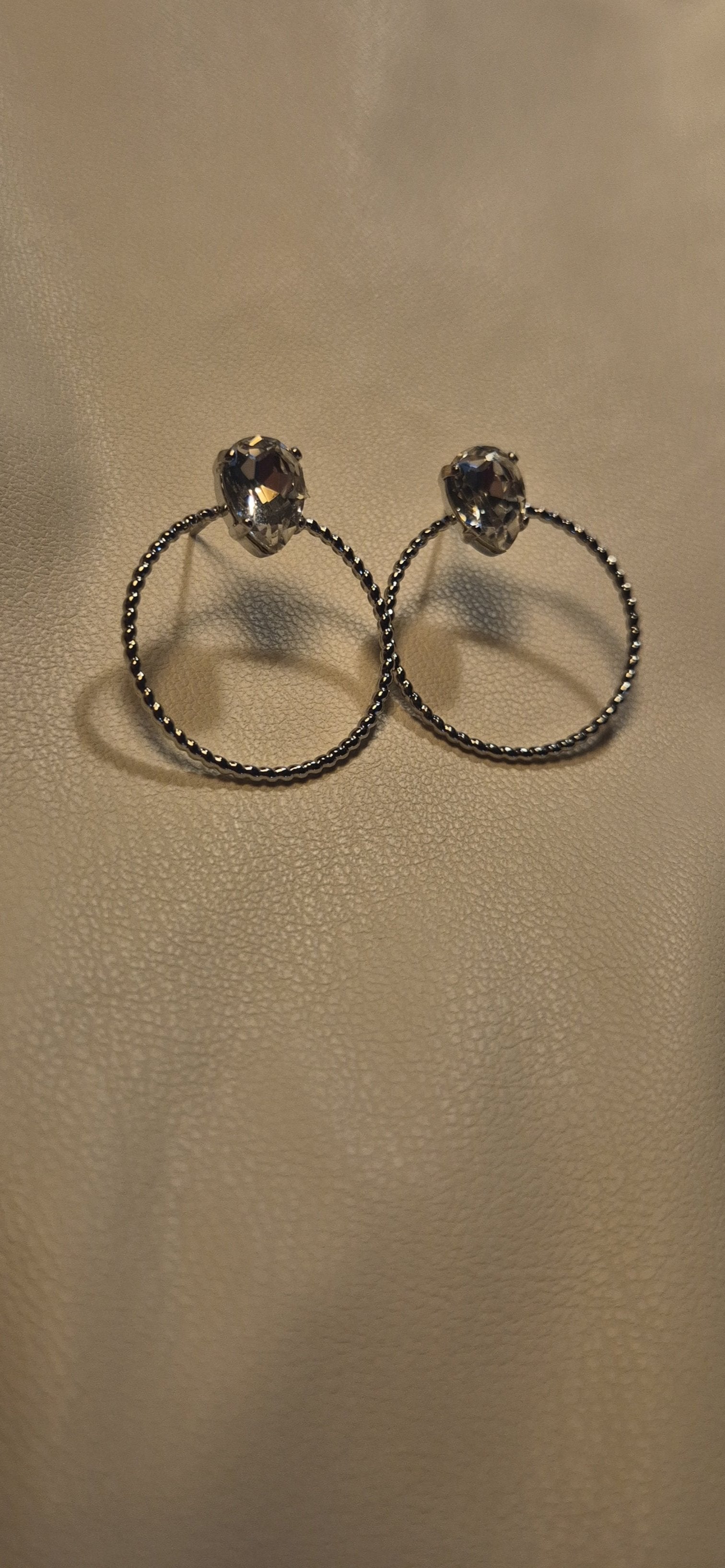 עגילים צמודים מעגל 20 מ"מ עם אבן קריסטל בצורת טיפה 10 על 7 מ"מ, צבע כסף