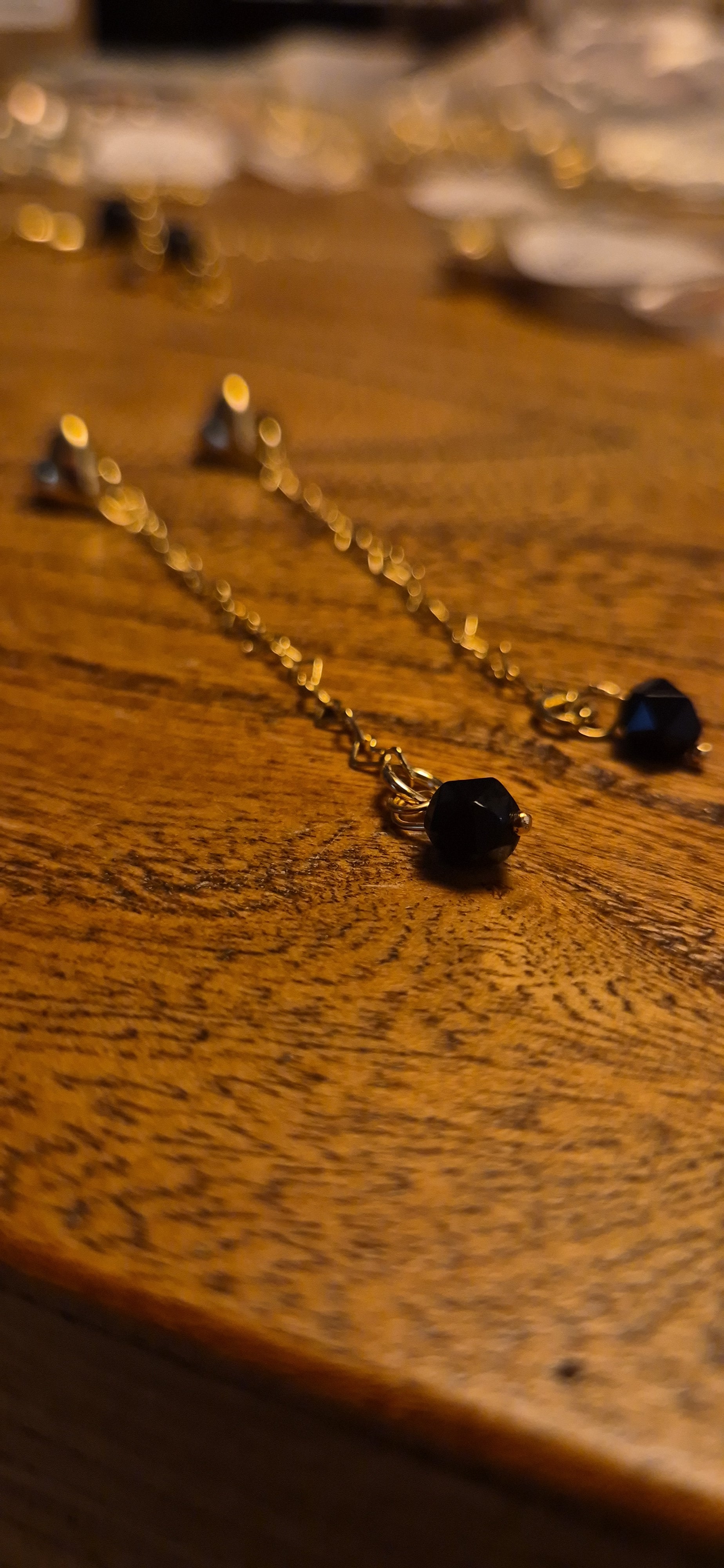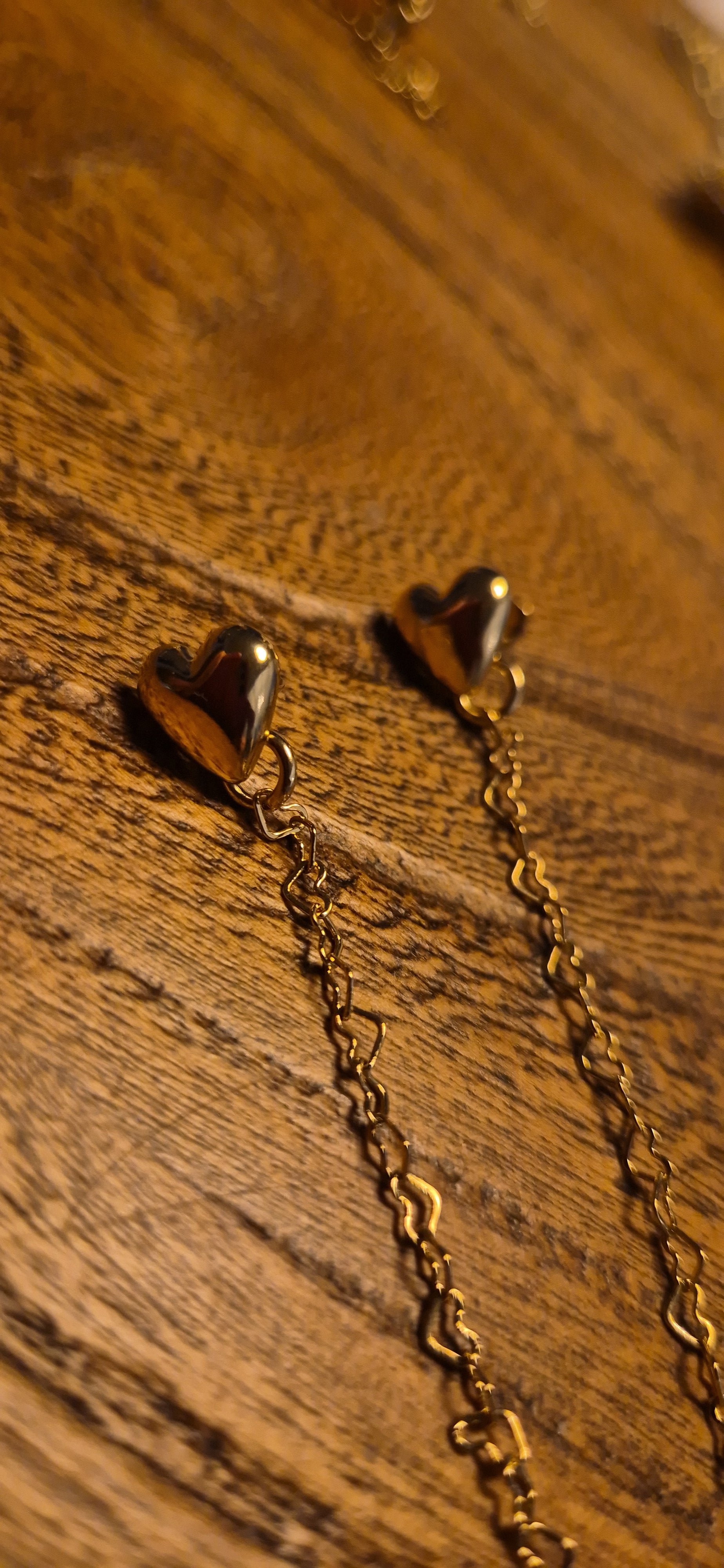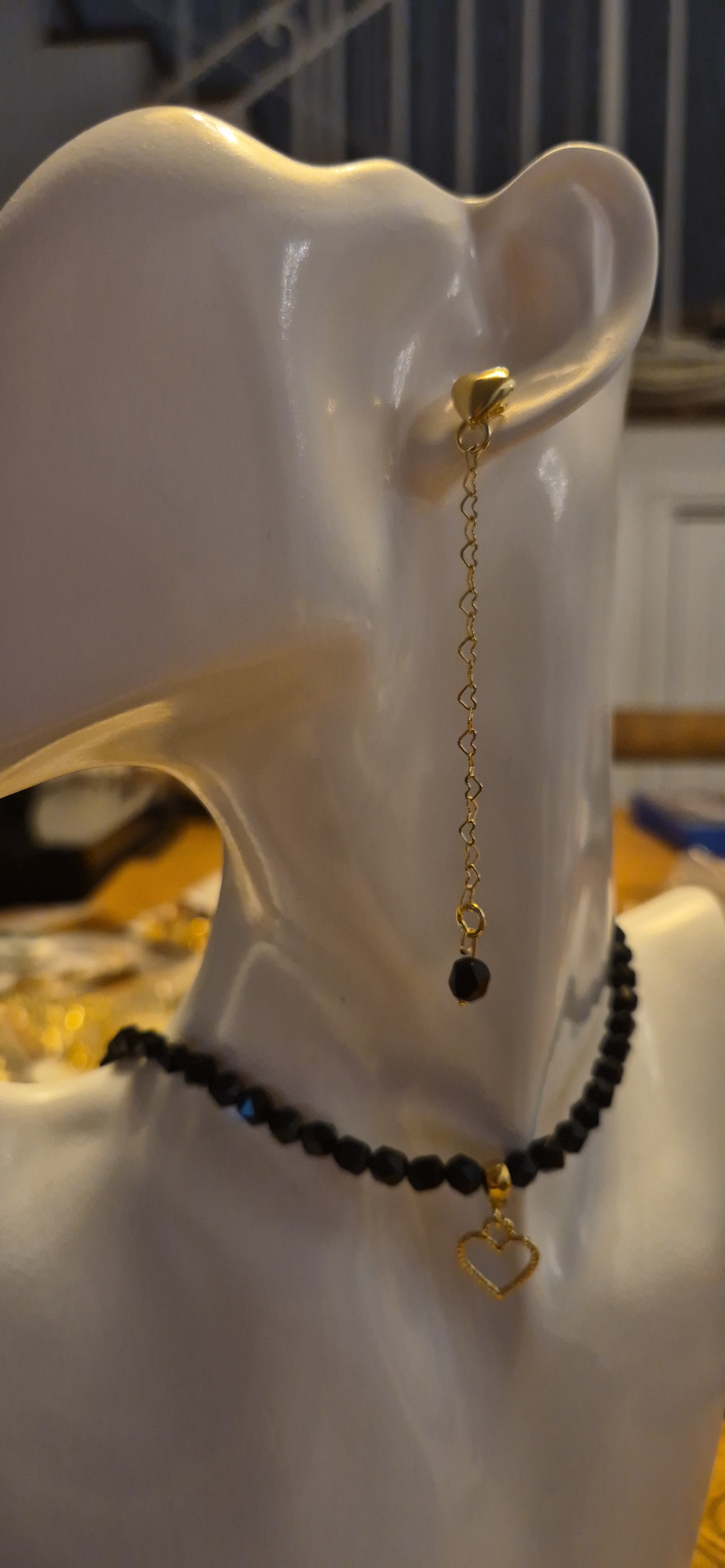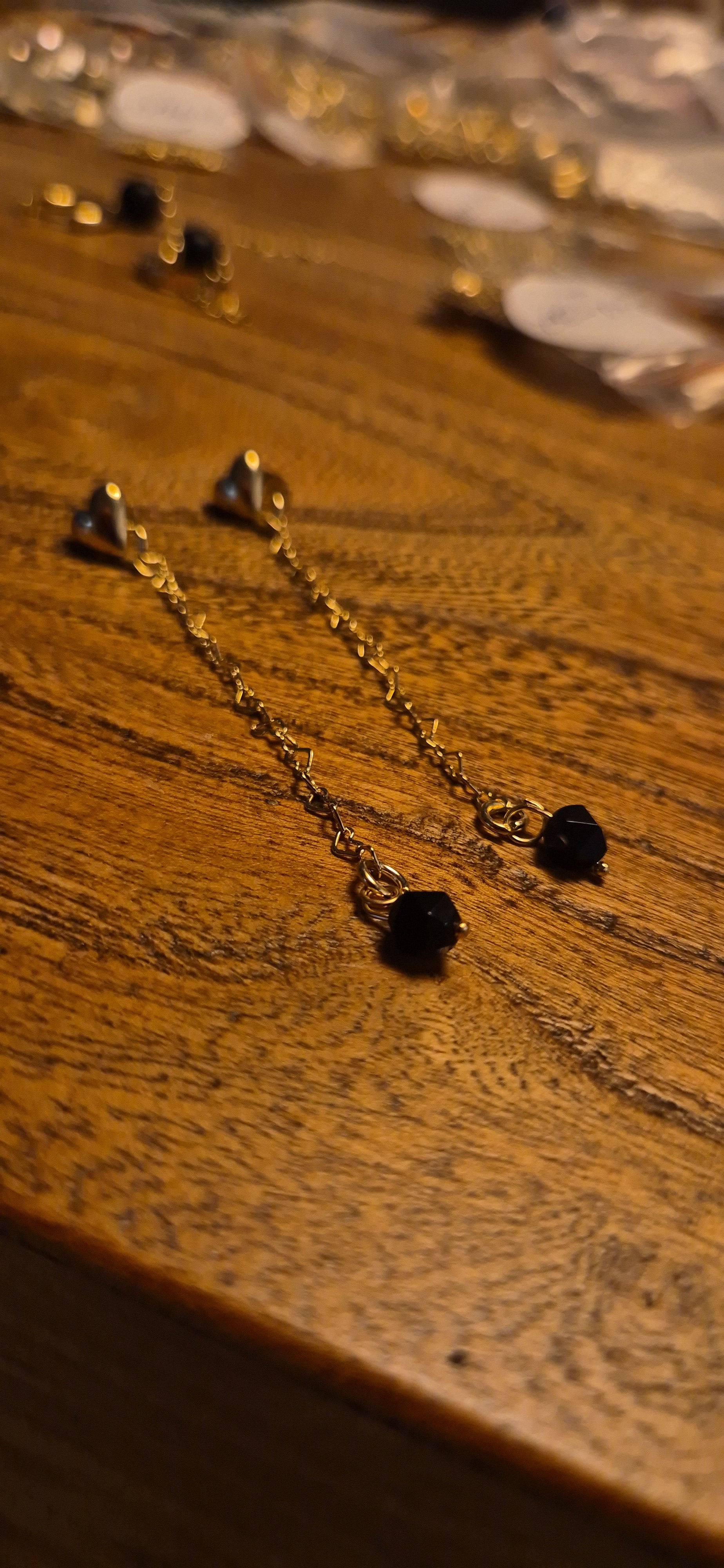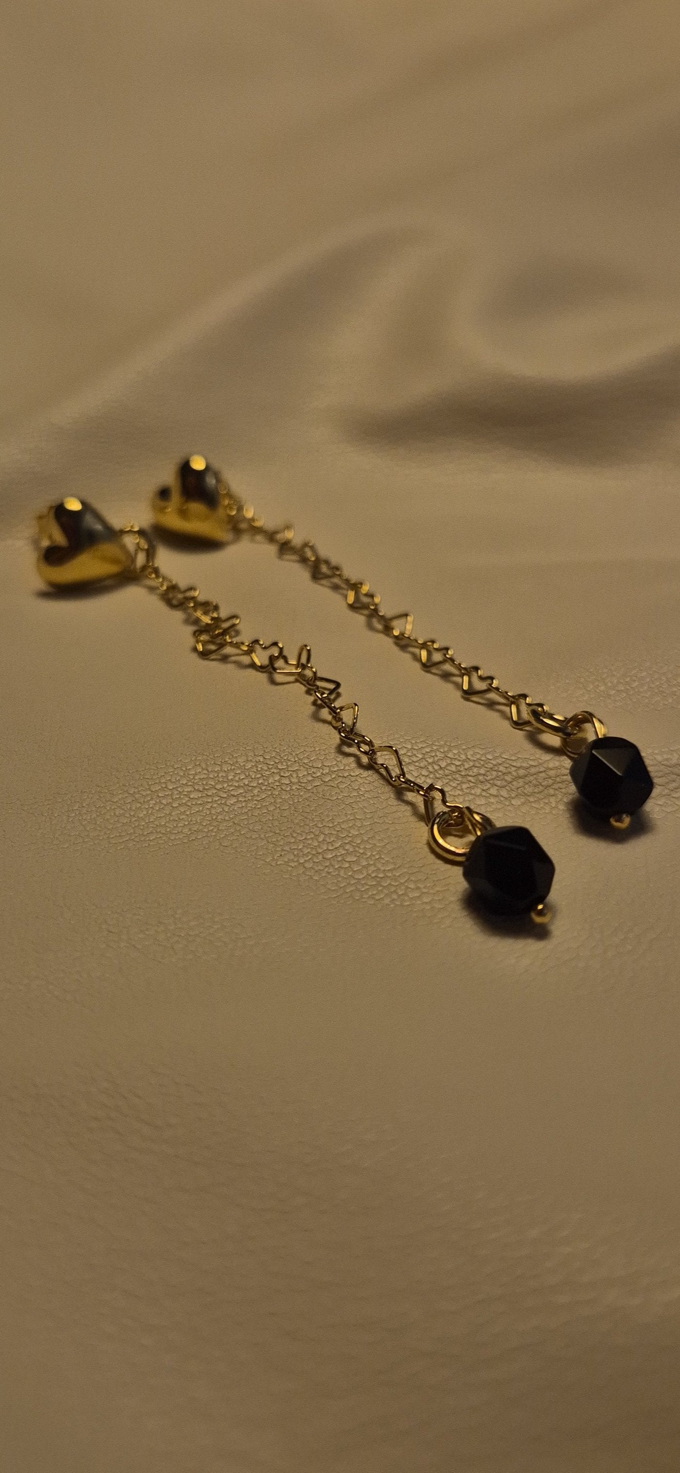 עגילי לב צמודים עם שרשרת דרופ ואבן שחורה בקצה, ציפוי זהב