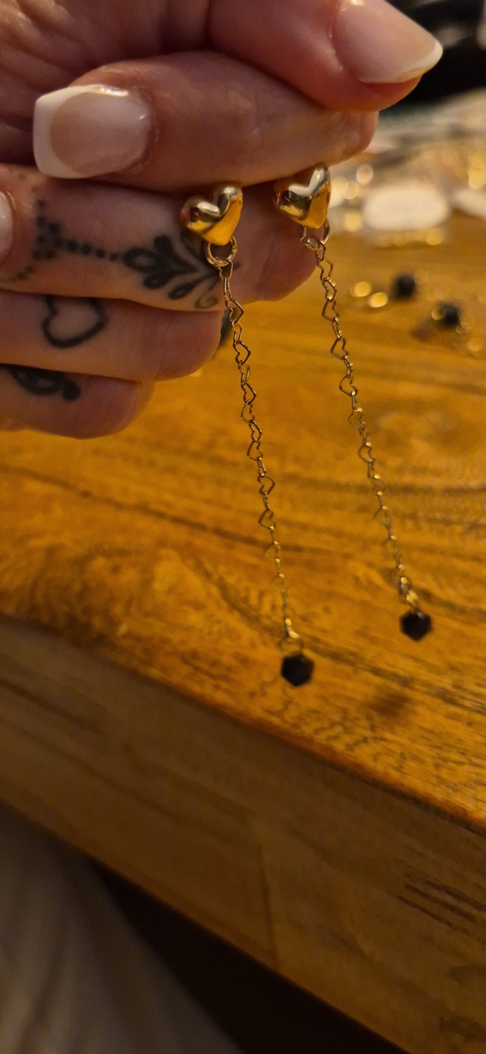 עגילי לב צמודים עם שרשרת דרופ לבבות עדינה וחרוז אבן שחורה קטנה, ציפוי זהב