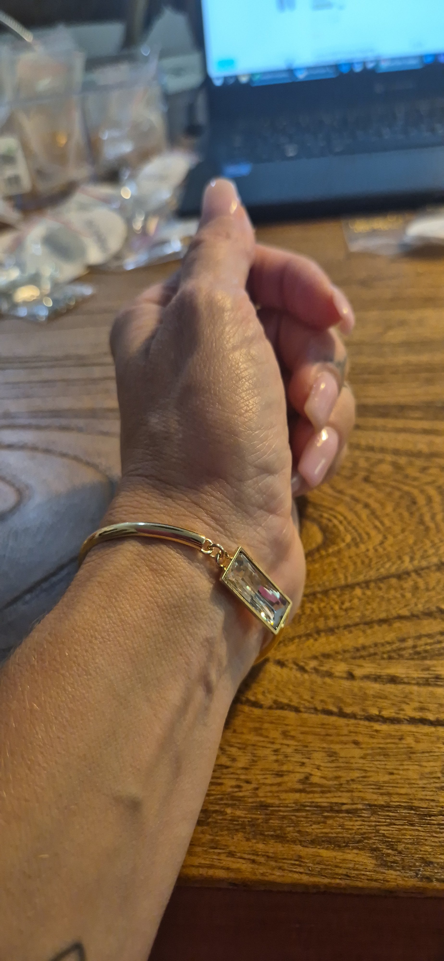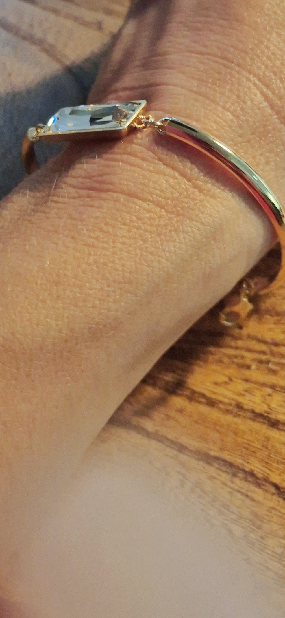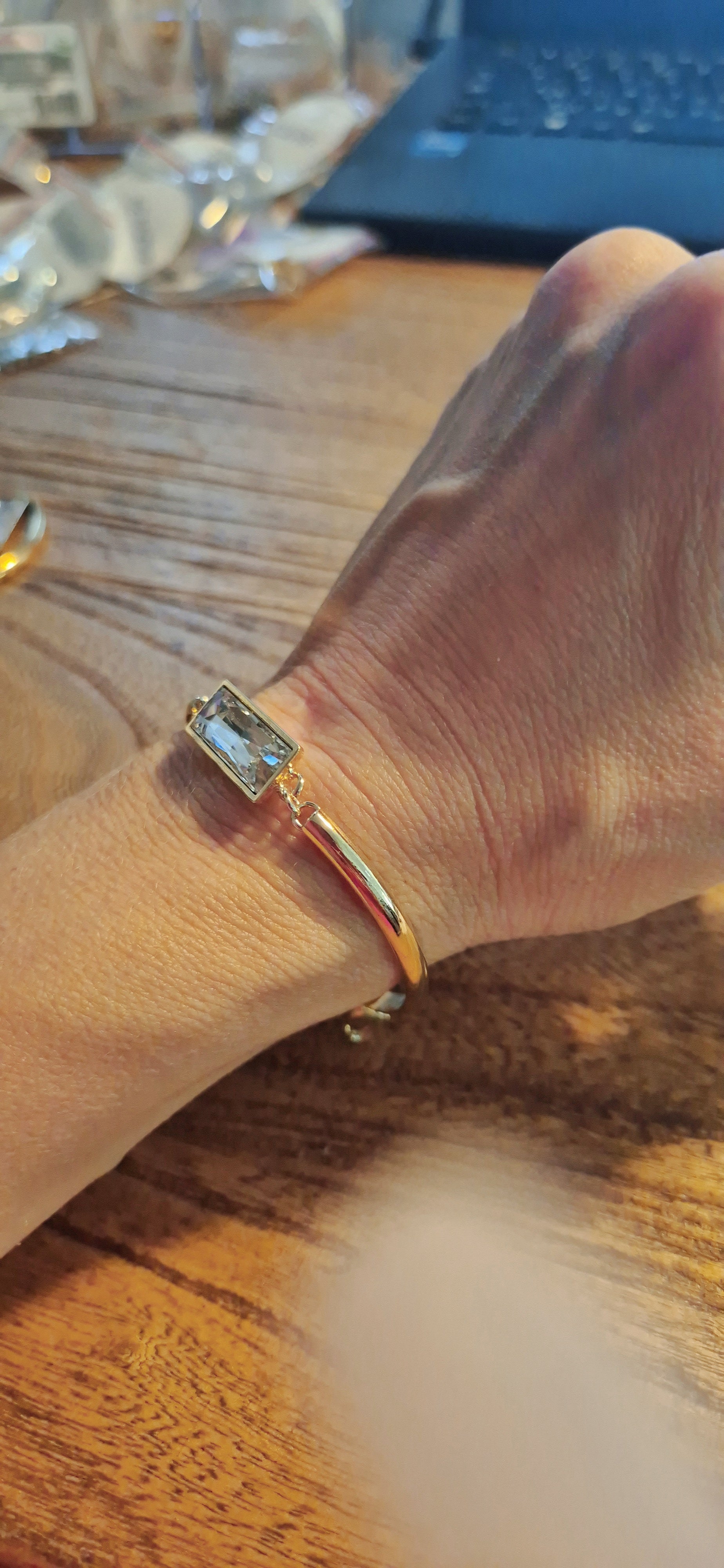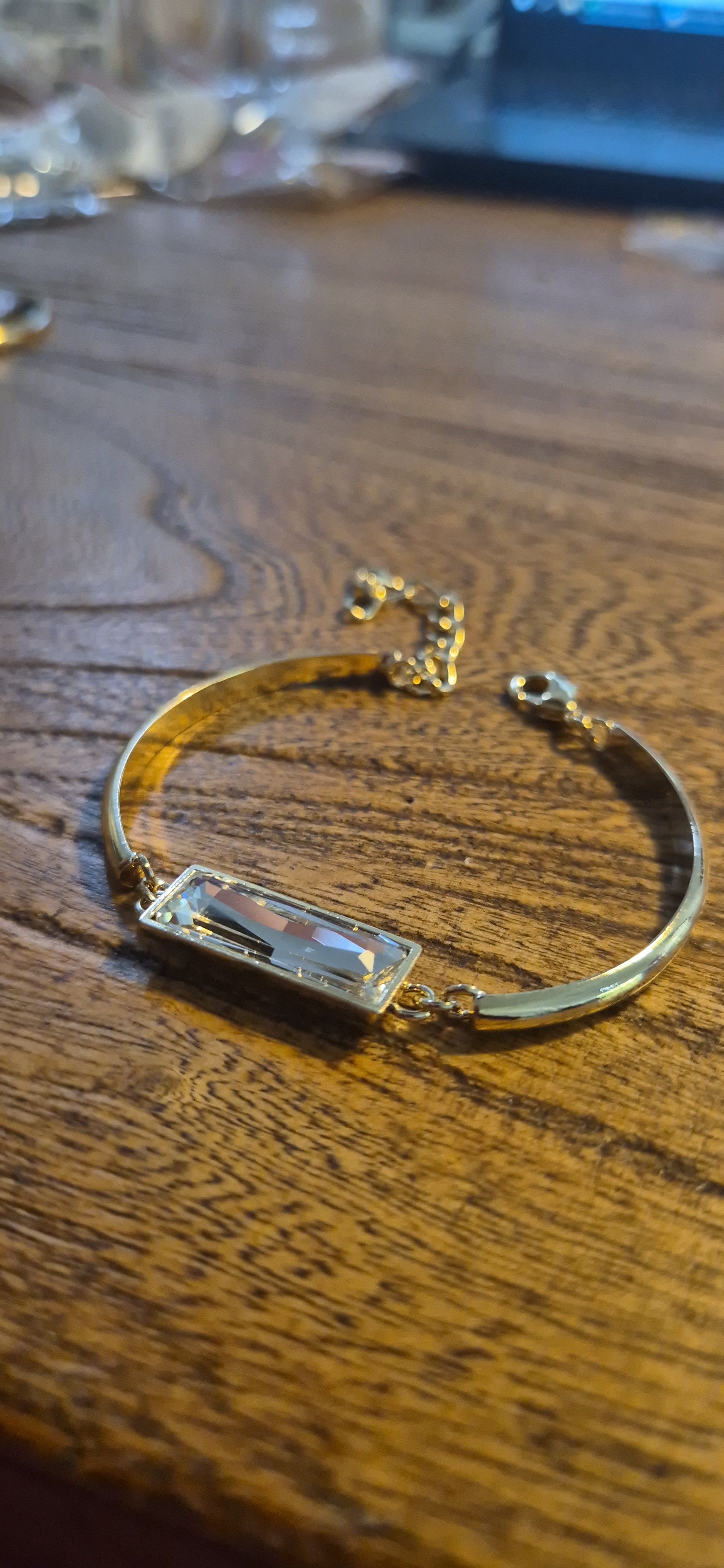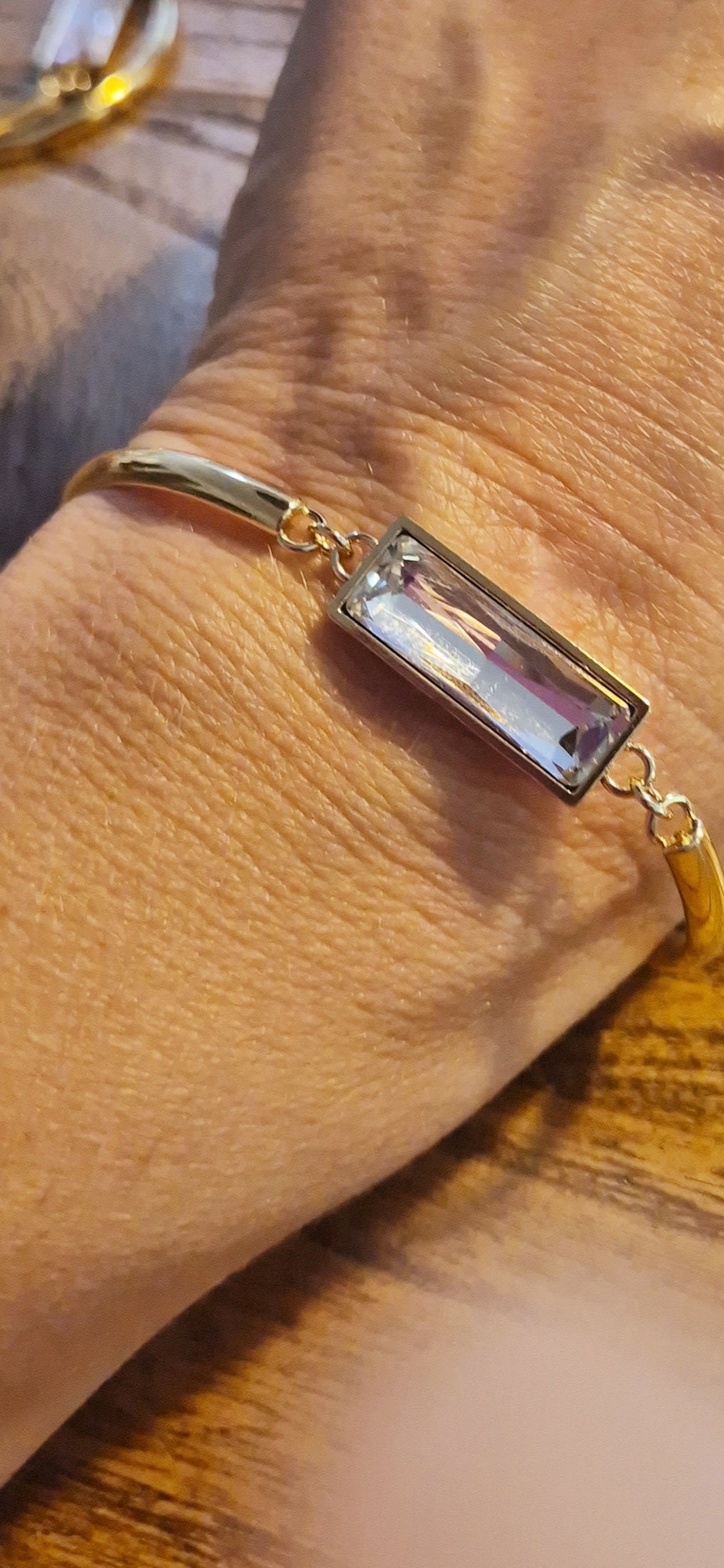 צמיד חישוק נפתח בציפוי זהב, עם אבן "באגט" קריסטל 21 על 7 מ"מ. לצמיד יש שרשרת הארכה של 5 ס"מ