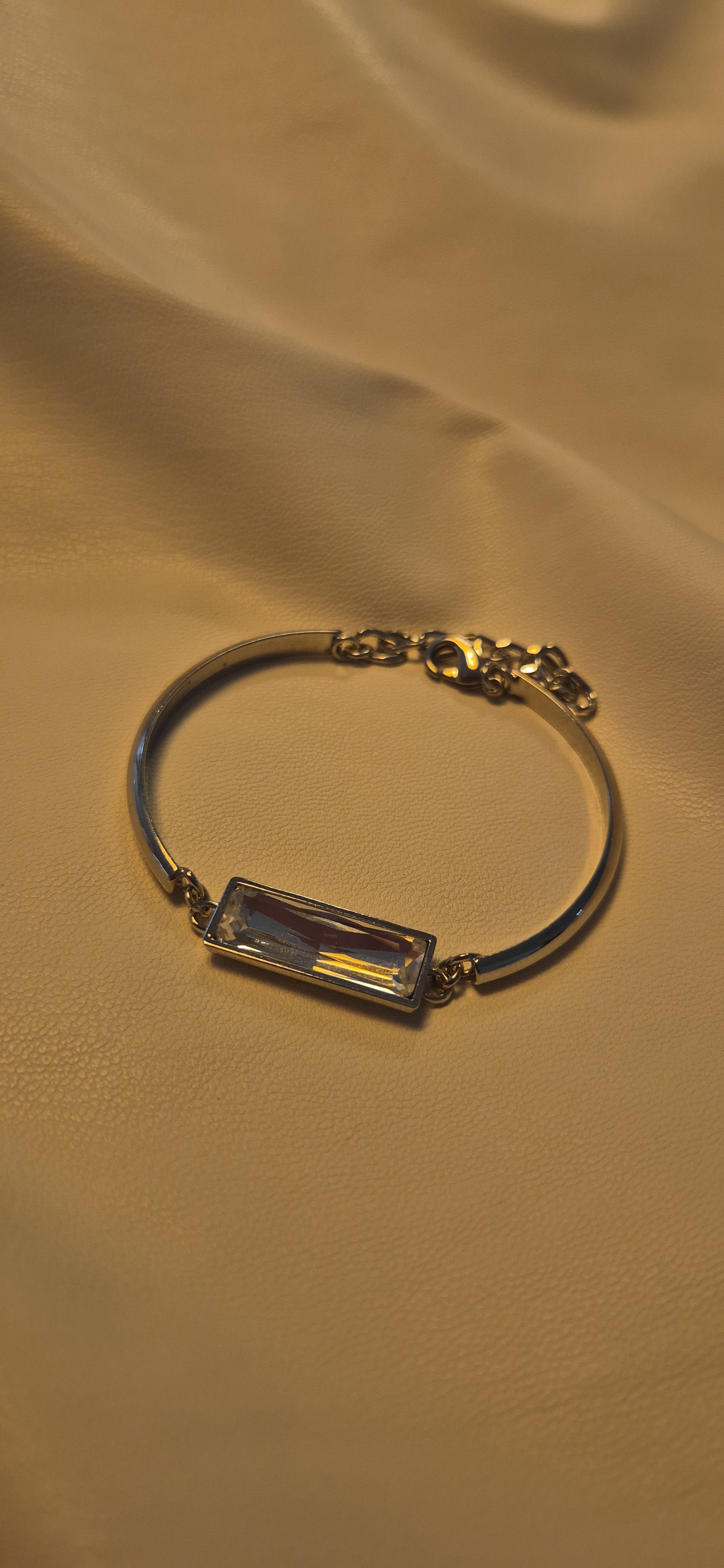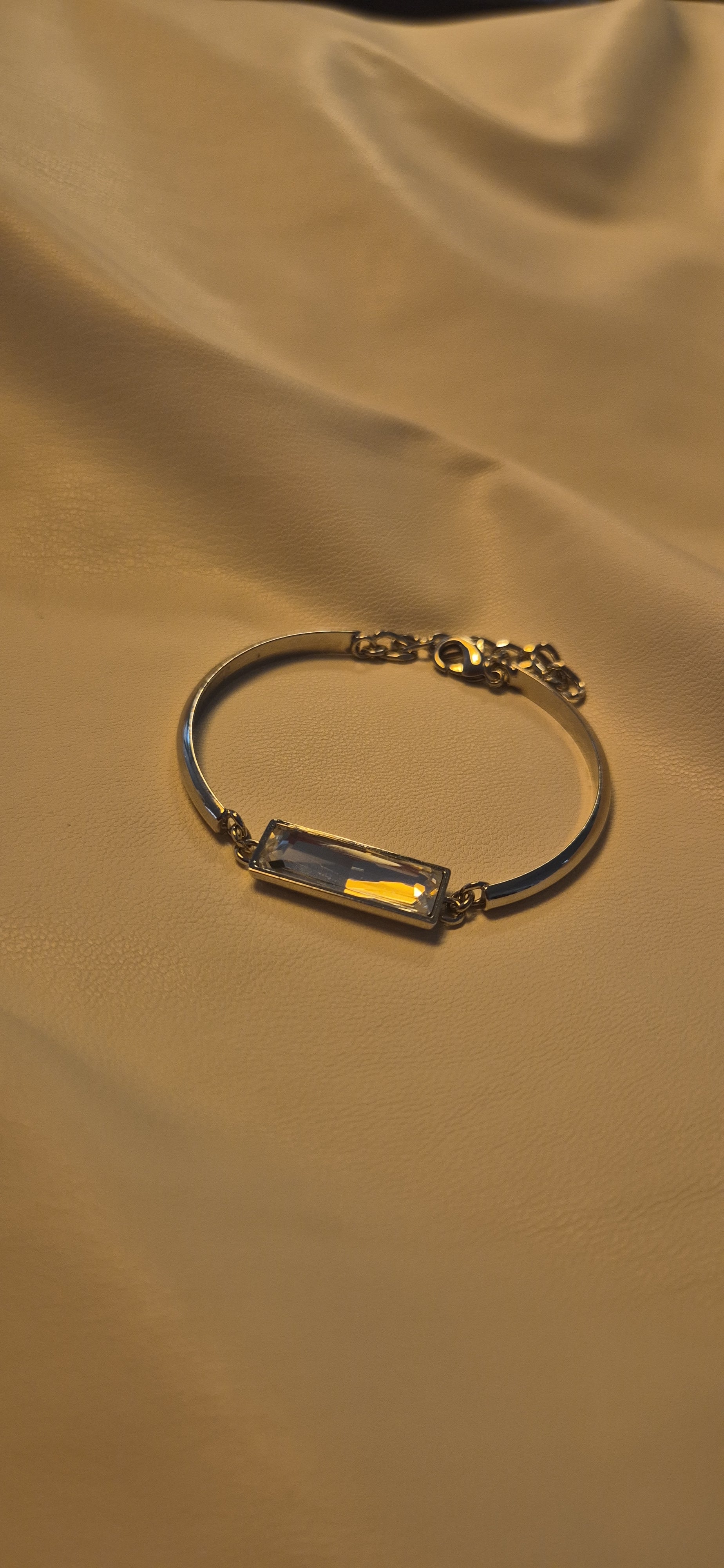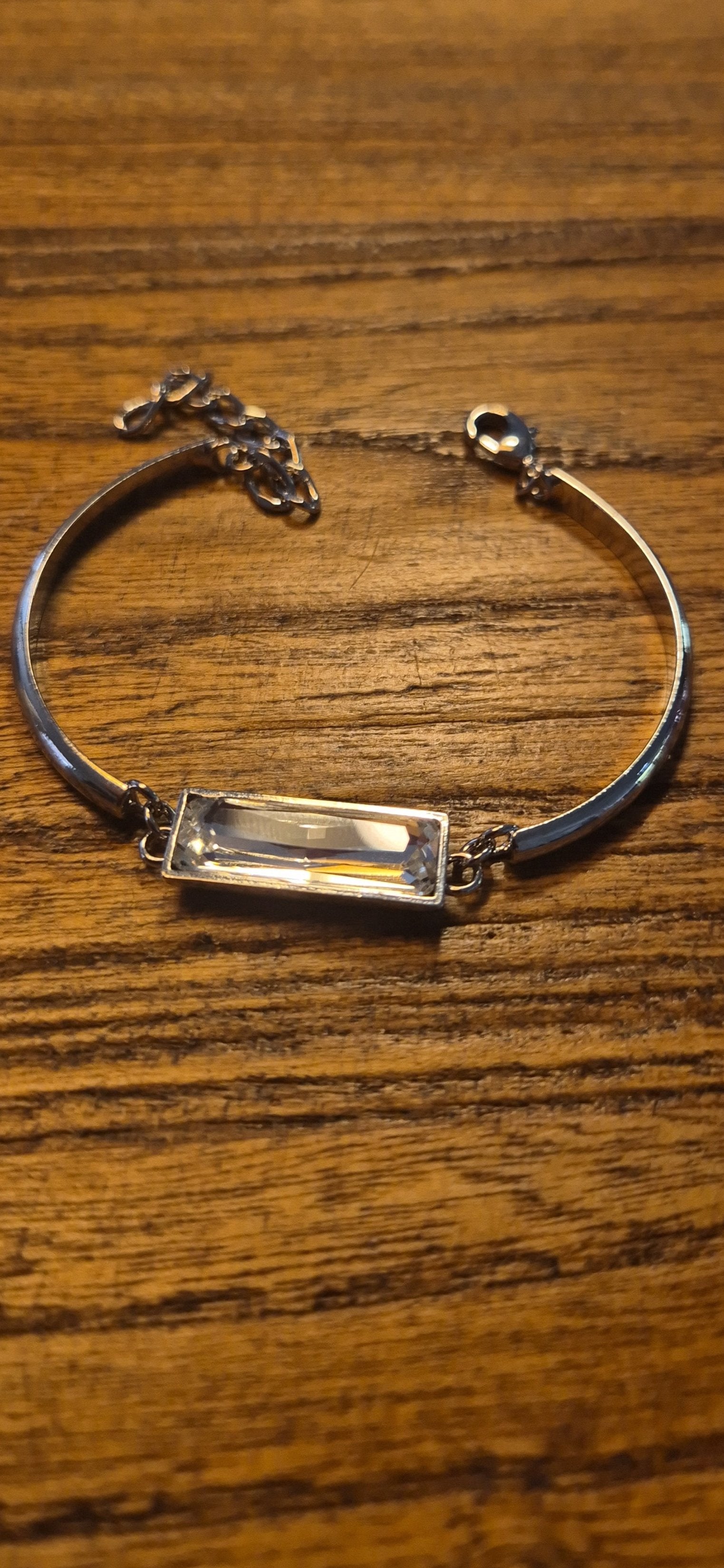 צמיד חישוק נפתח, עם אבן "באגט" קריסטל בגודל 21 על 7 מ"מ. לצמיד יש שרשרת הארכה של 5 ס"מ, צבע כסף