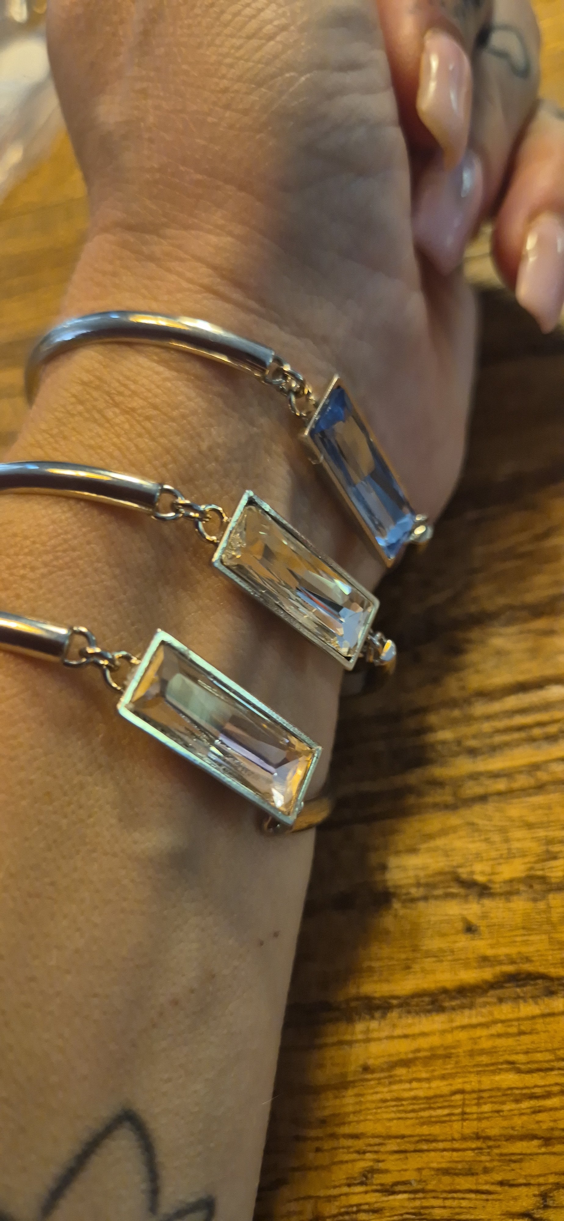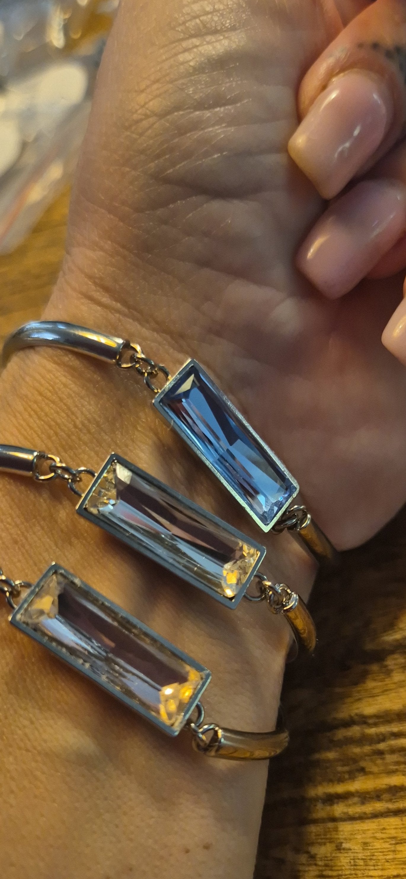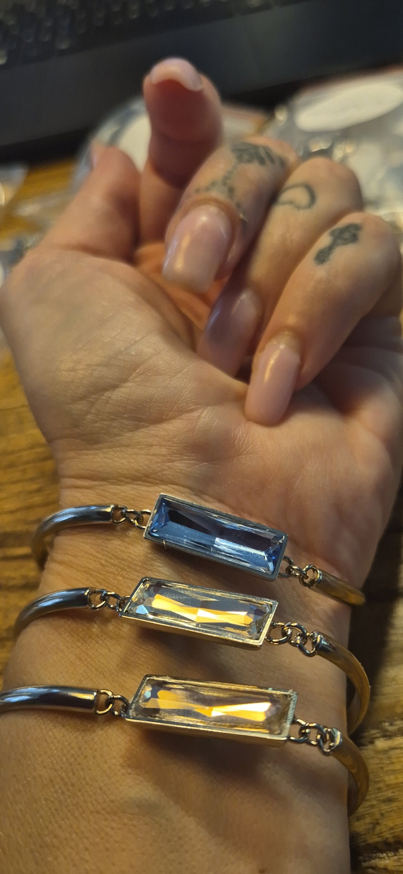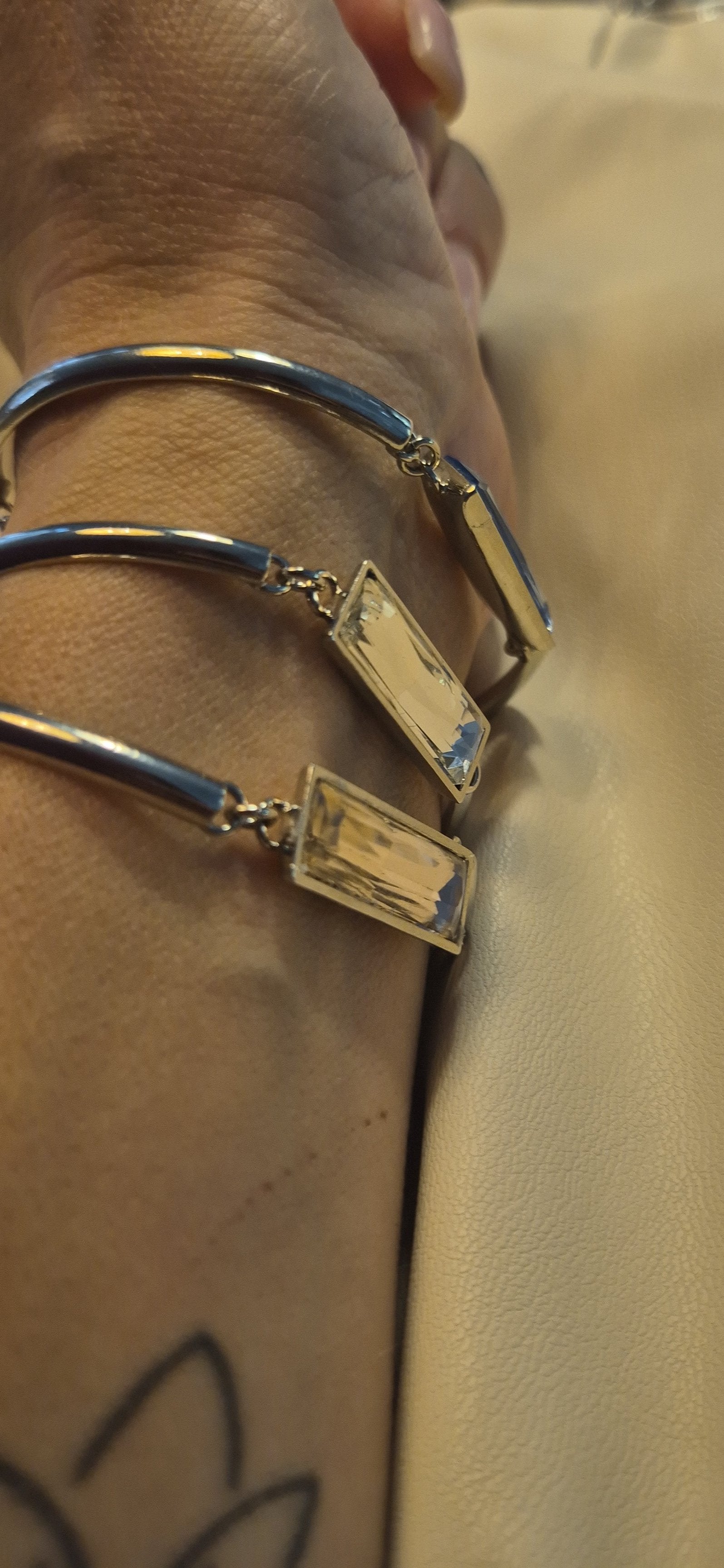צמיד חישוק נפתח, עם אבן "באגט" קריסטל בגודל 21 על 7 מ"מ. לצמיד יש שרשרת הארכה של 5 ס"מ, צבע כסף