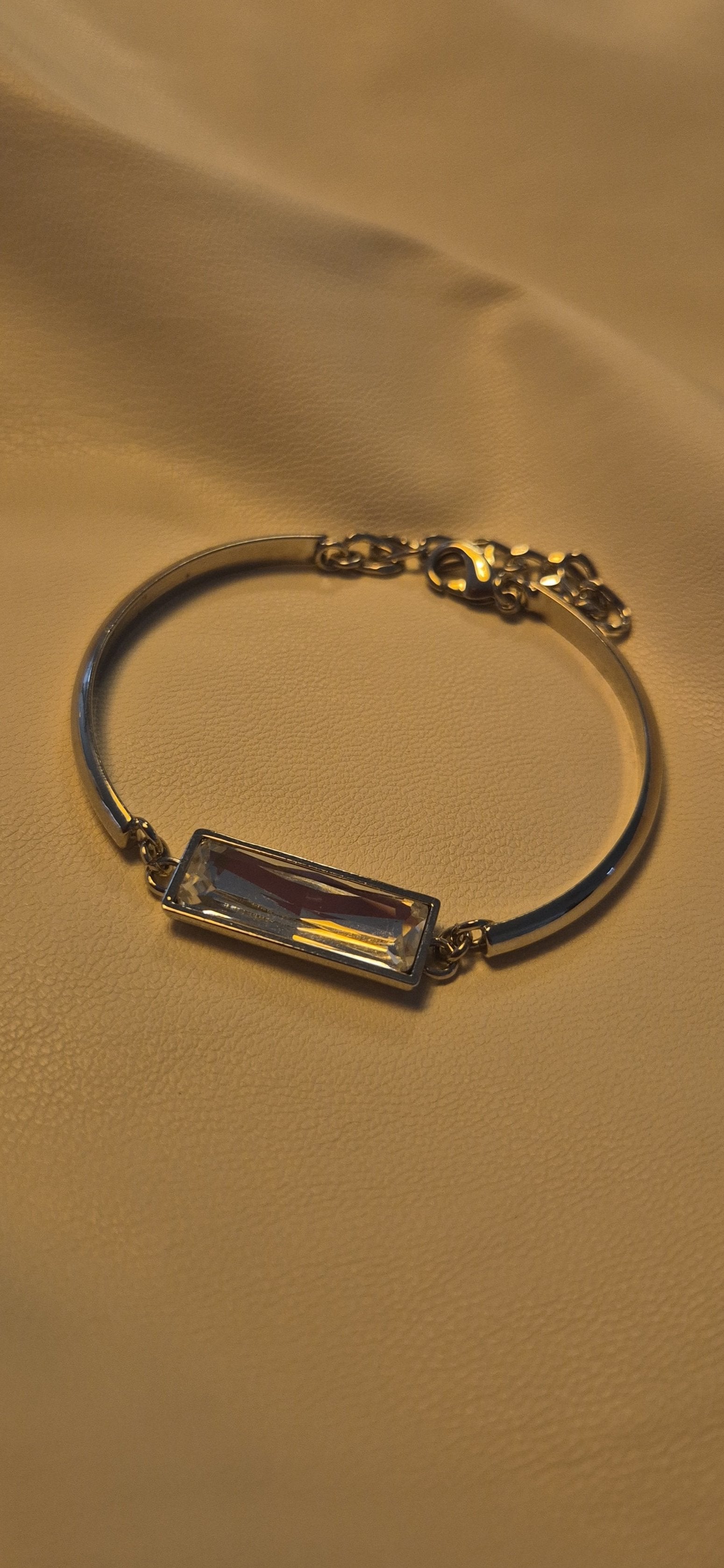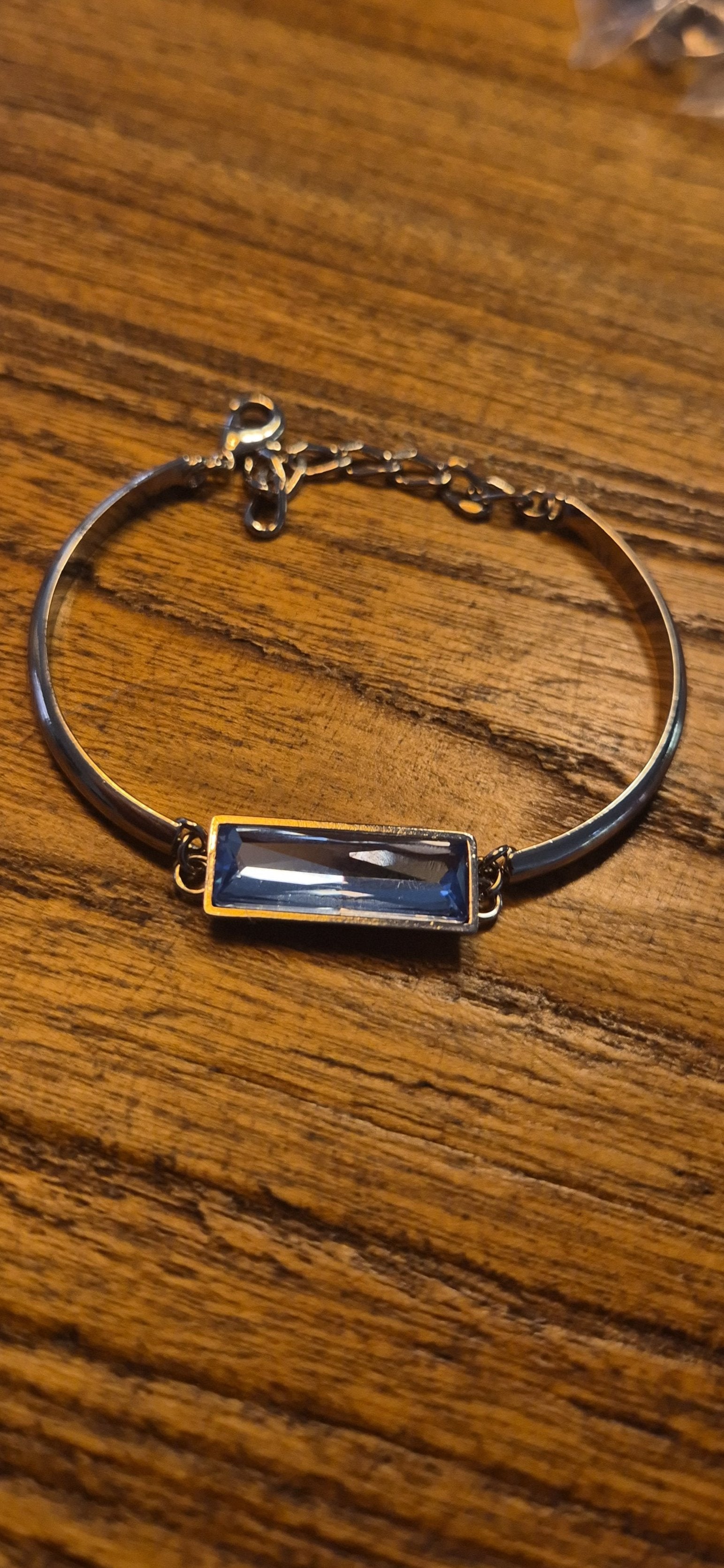 צמיד חישוק נפתח, עם אבן "באגט" קריסטל בצבע תכלת בגודל 21 על 7 מ"מ. לצמיד יש שרשרת הארכה של 5 ס"מ, צבע כסף