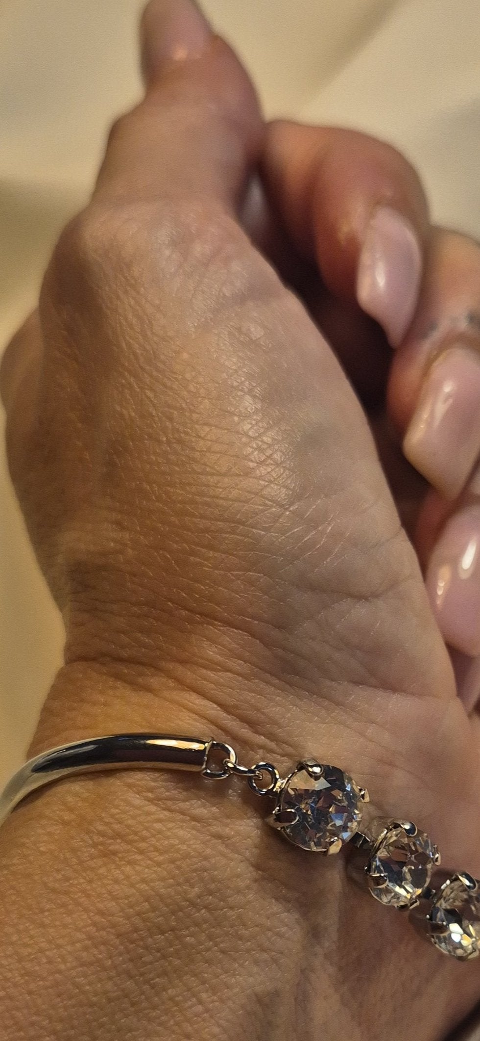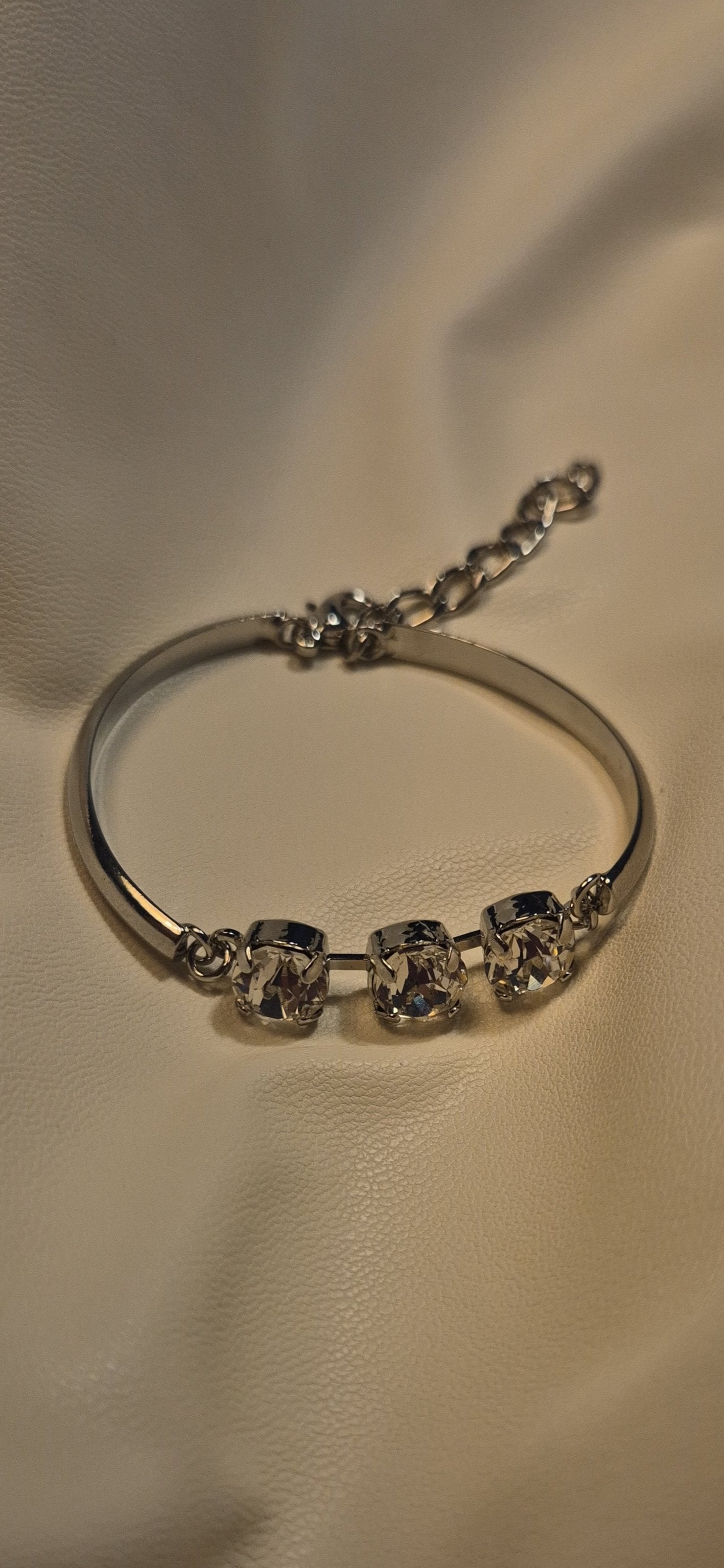 צמיד חישוק נפתח, עם 3 אבני קריסטל 8 מ"מ, לצמיד יש שרשרת הארכה של 5 ס"מ, צבע כסף