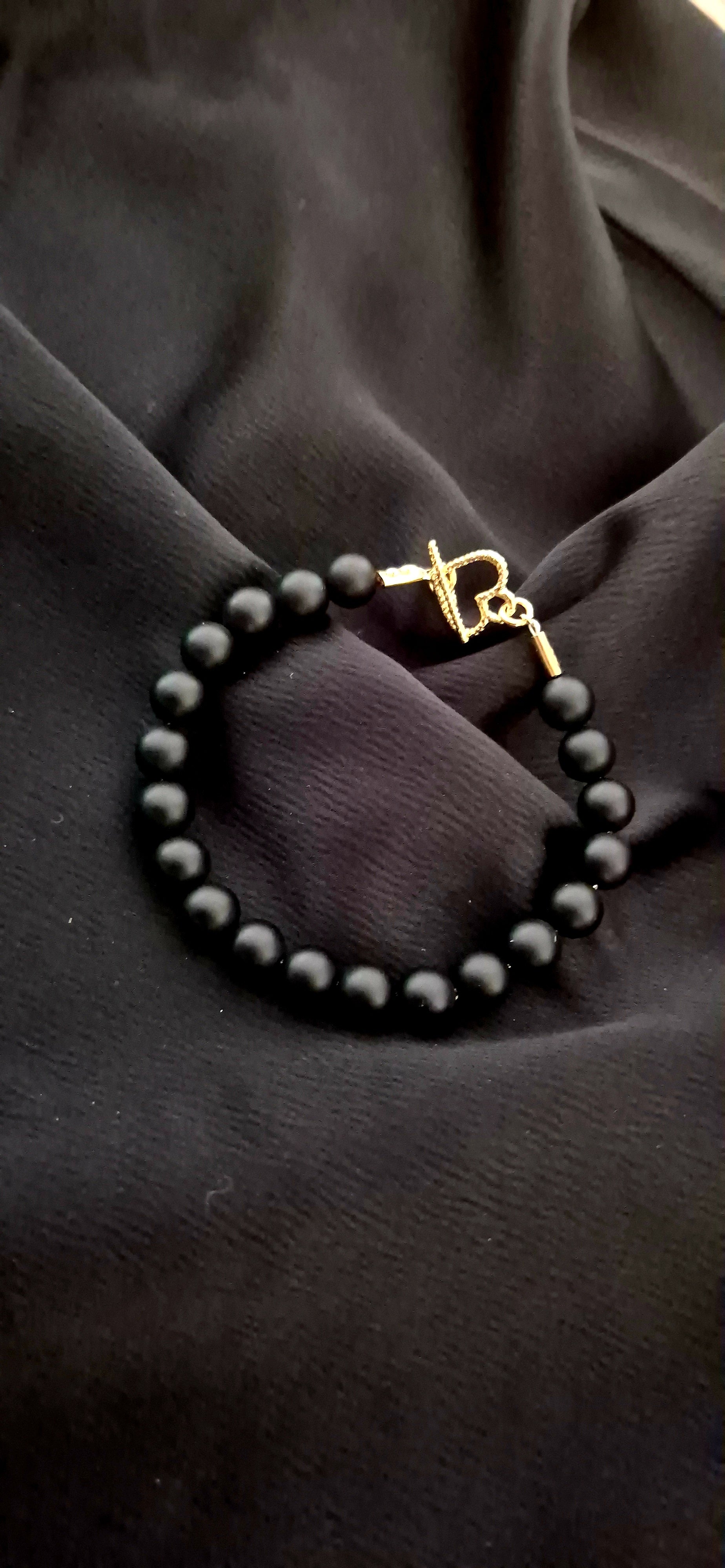 צמיד חרוזי אבן אגת שחורה 8 מ"מ עם סוגר טי לב, אורך הצמיד 20 ס"מ