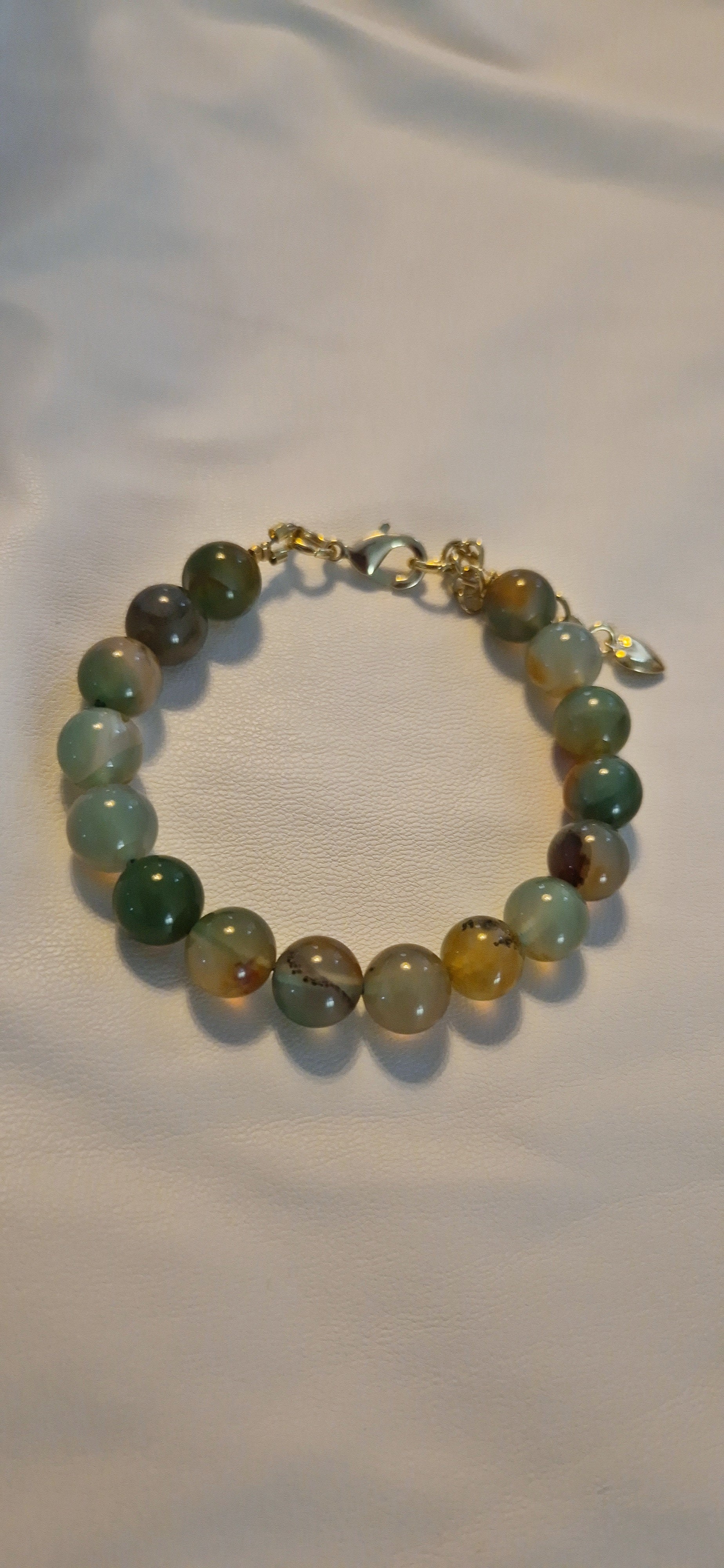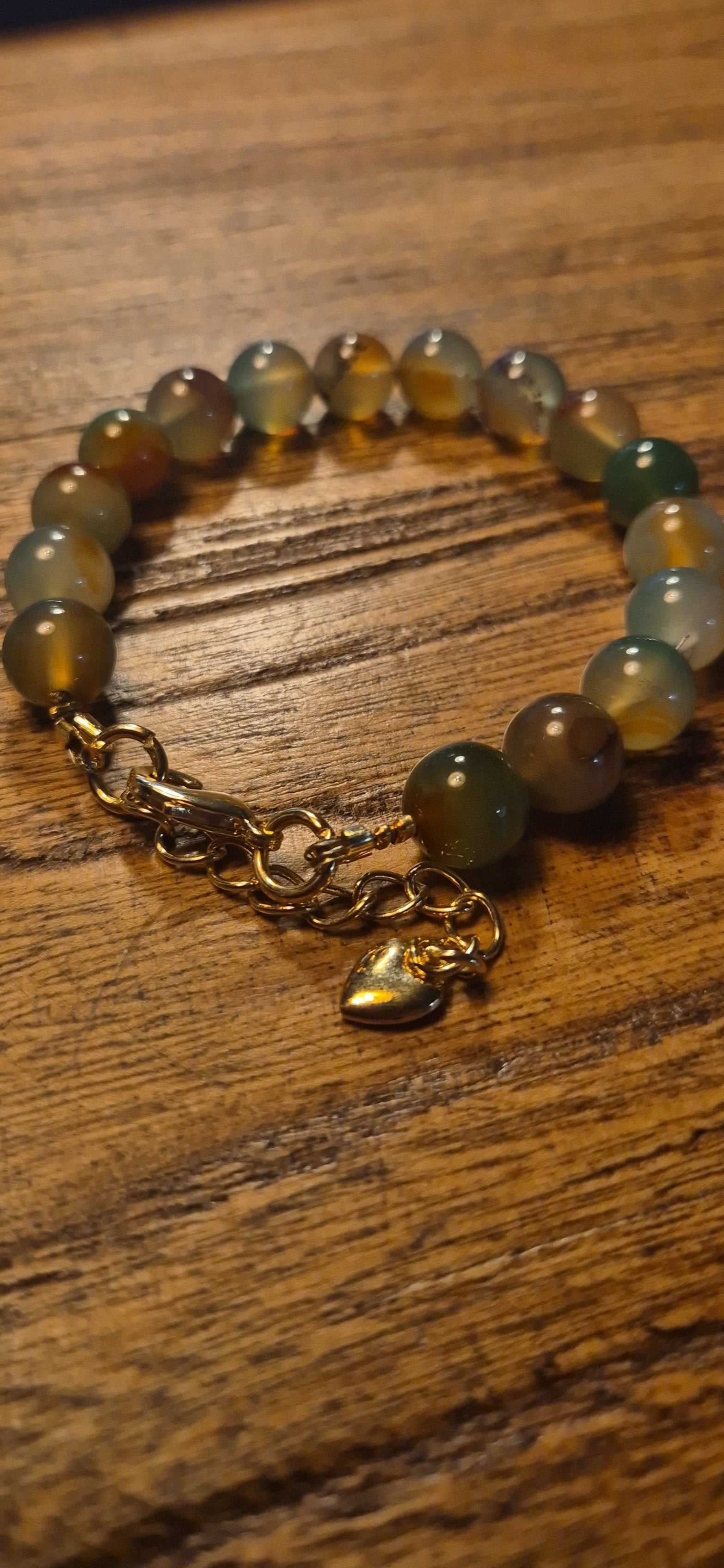 צמיד חרוזי אבן אגת 8 מ"מ בגווני ירוק, אורך הצמיד 20 ס"מ, עם תוספת הארכה של 5 ס"מ ולב קטן בקצה בציפוי זהב