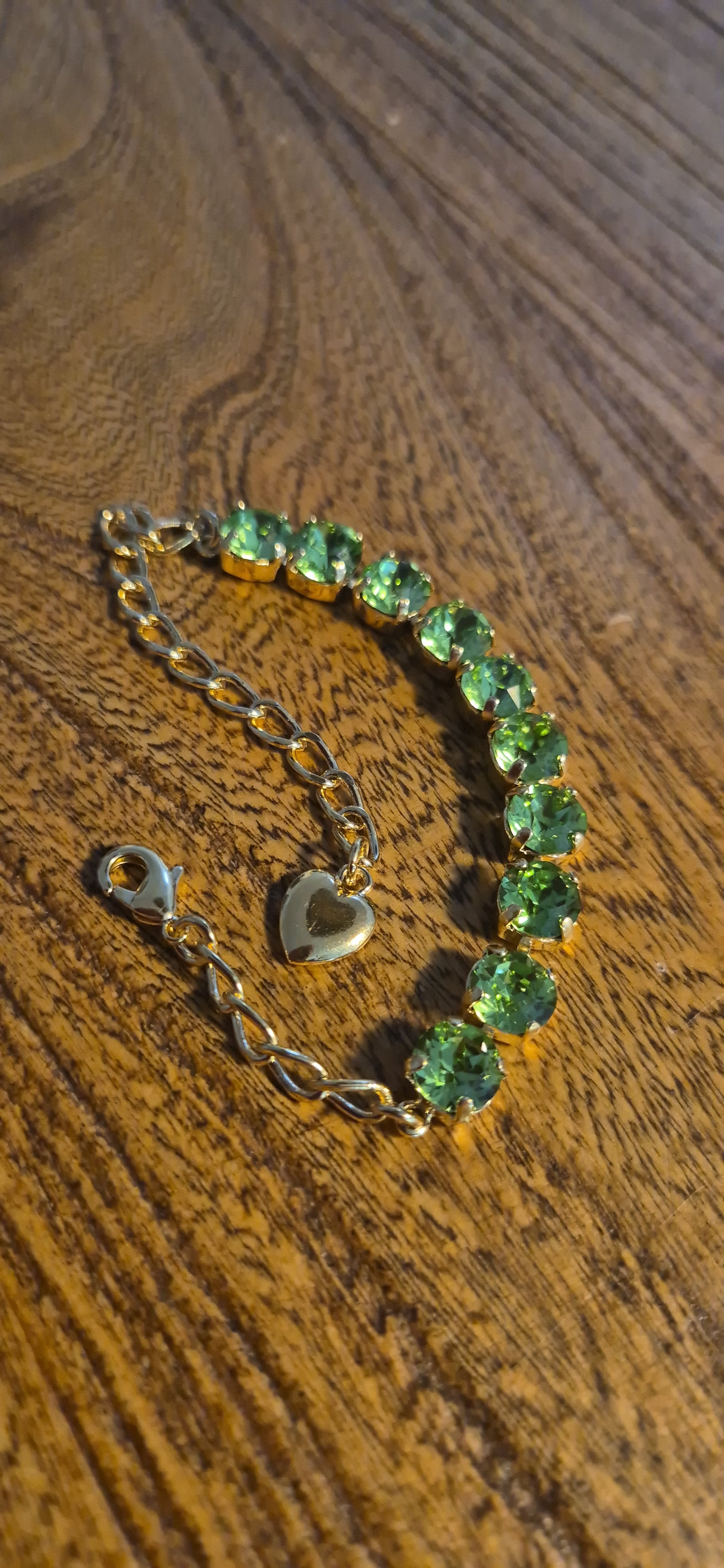 צמיד משובץ 10 אבני קריסטל ירוקות, לצמיד שרשרת הארכה עם לב קטן בקצה, ציפוי זהב