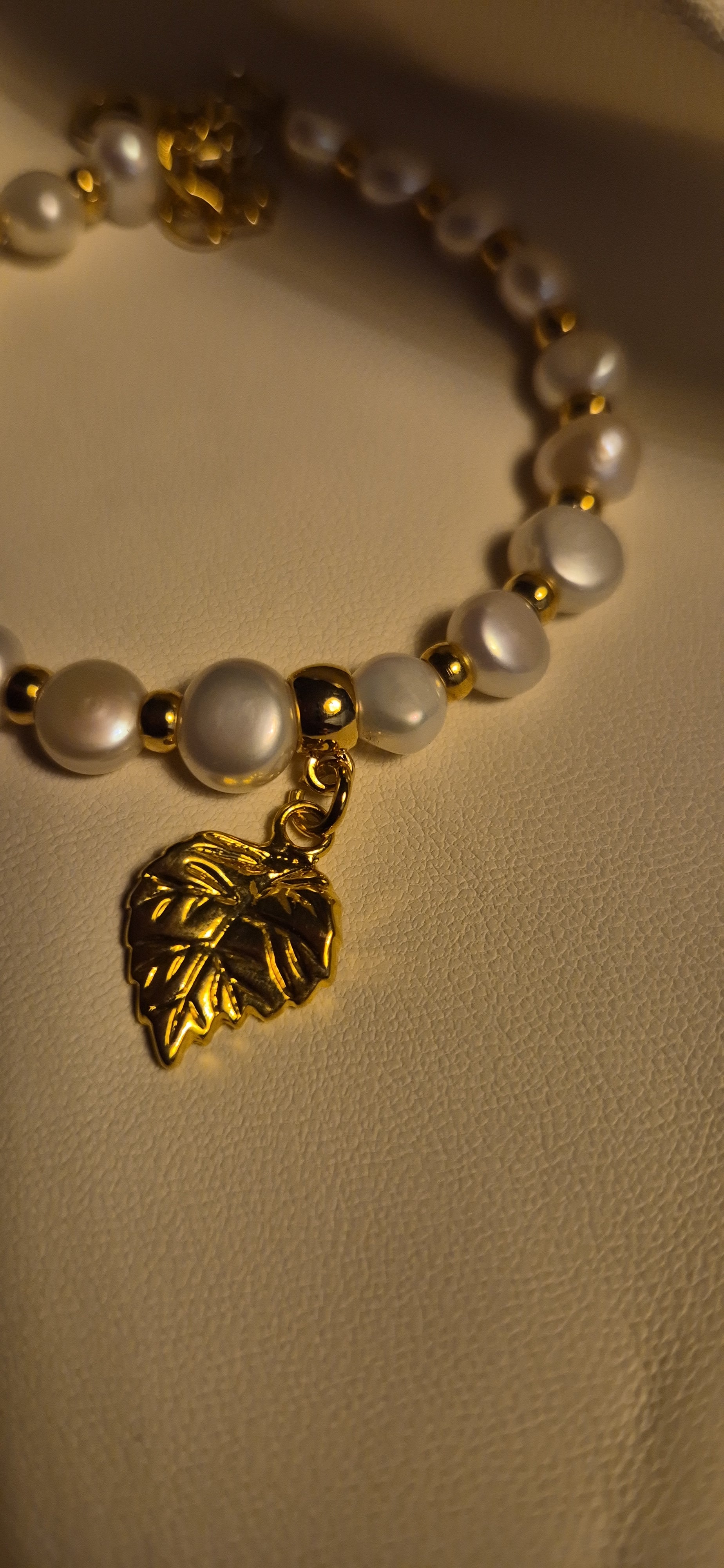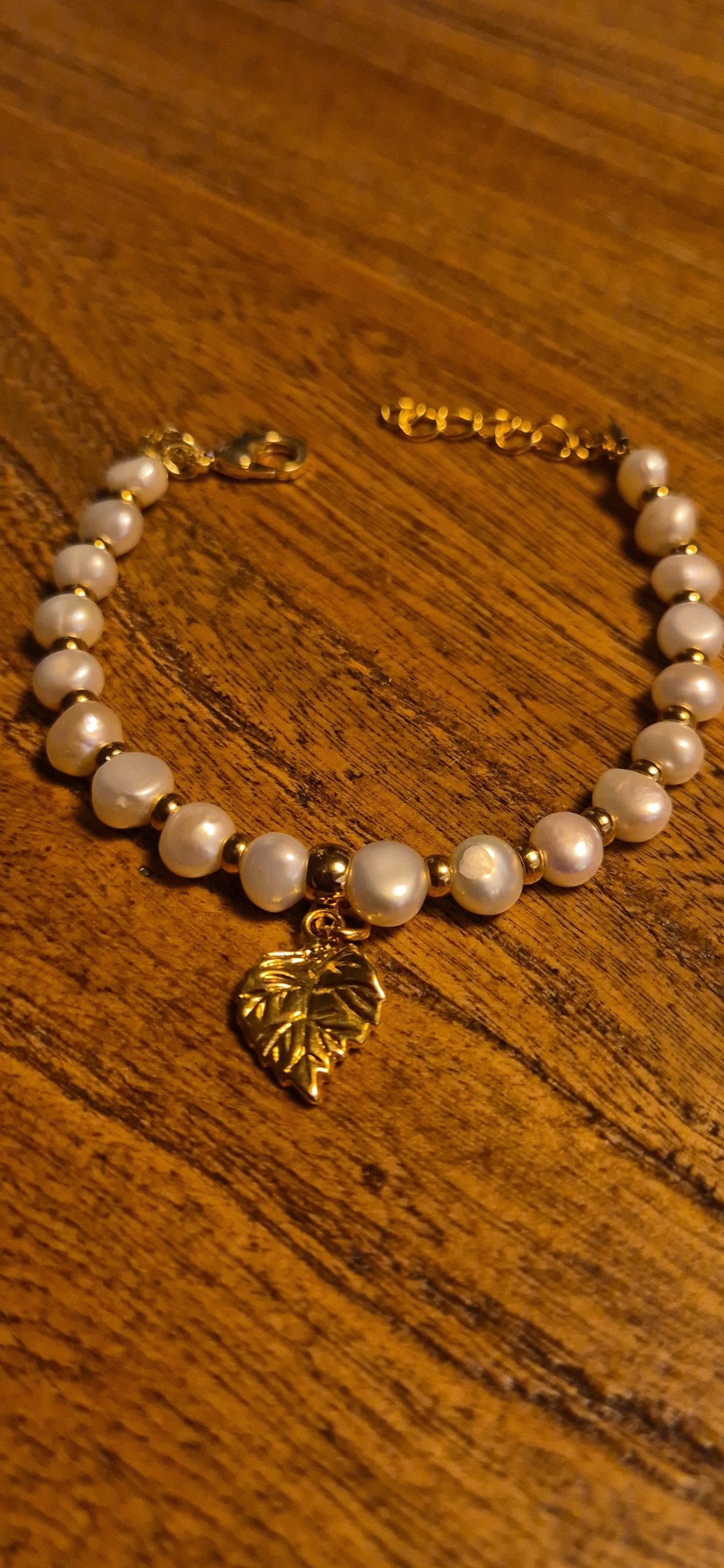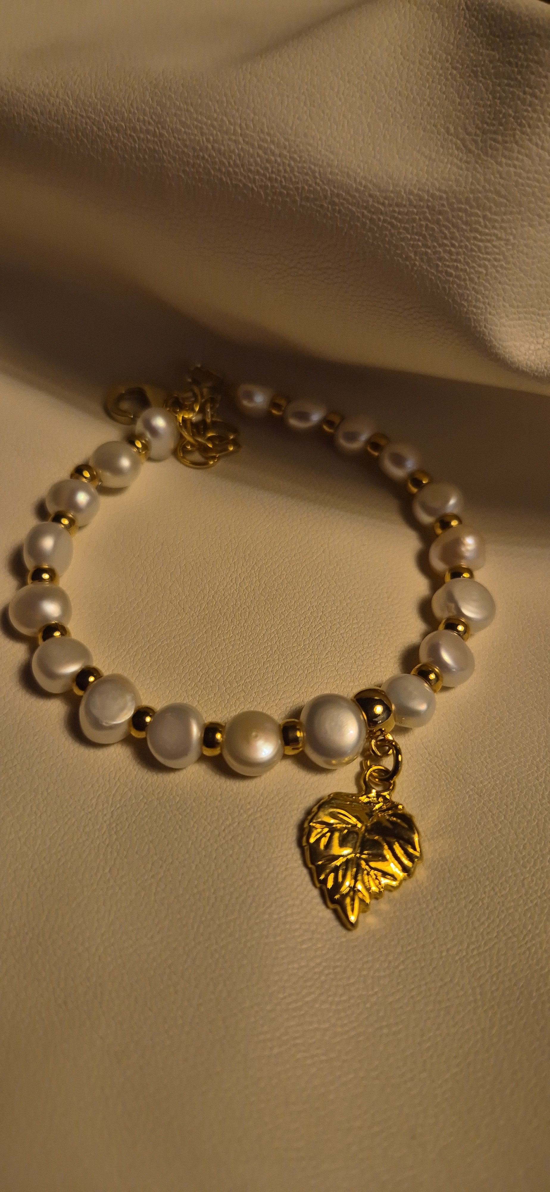 צמיד פנינים טבעיות, מופרדות ע"י חרוזים קטנים, עם צ'ארם עלה, אורך הצמיד 20 ס"מ עם שרשרת הארכה של 4 ס"מ, ציפוי זהב