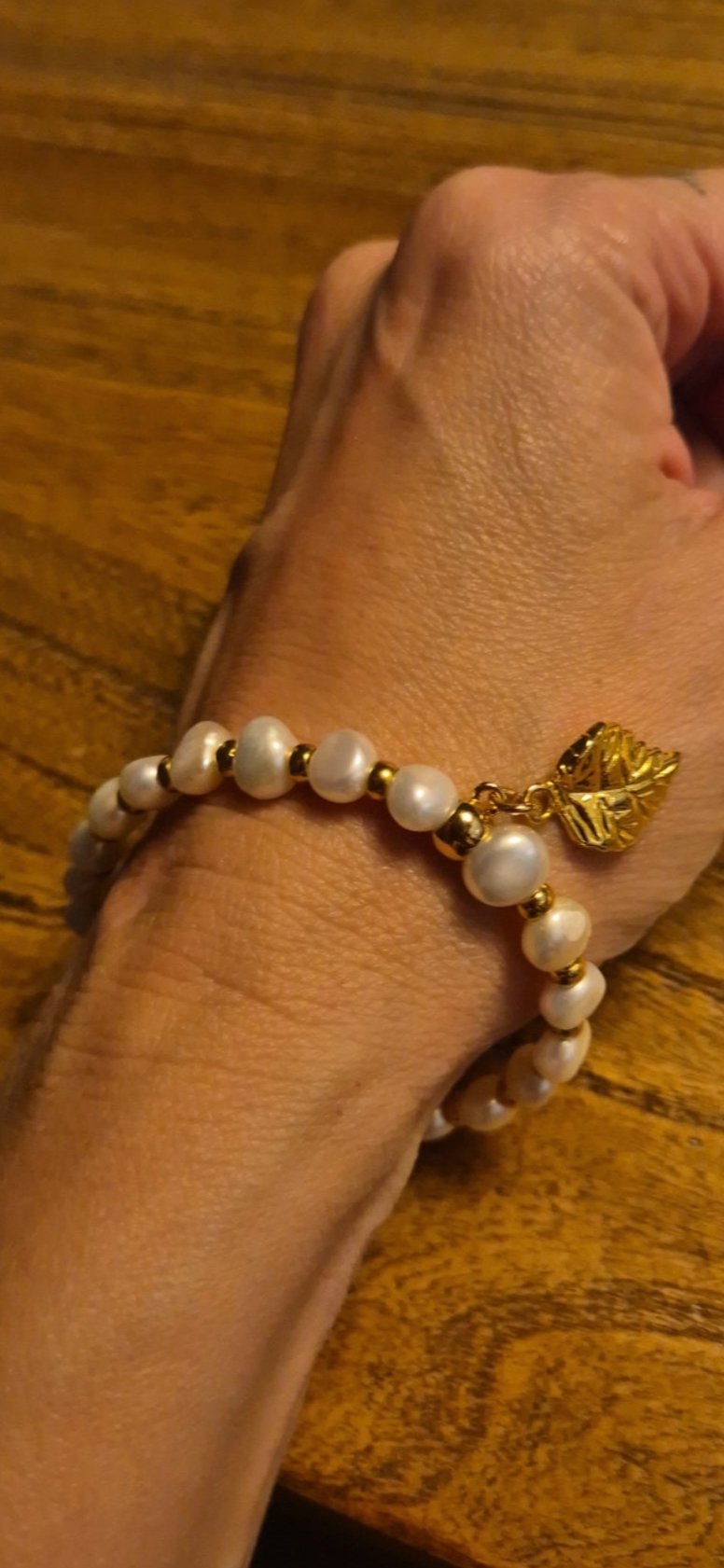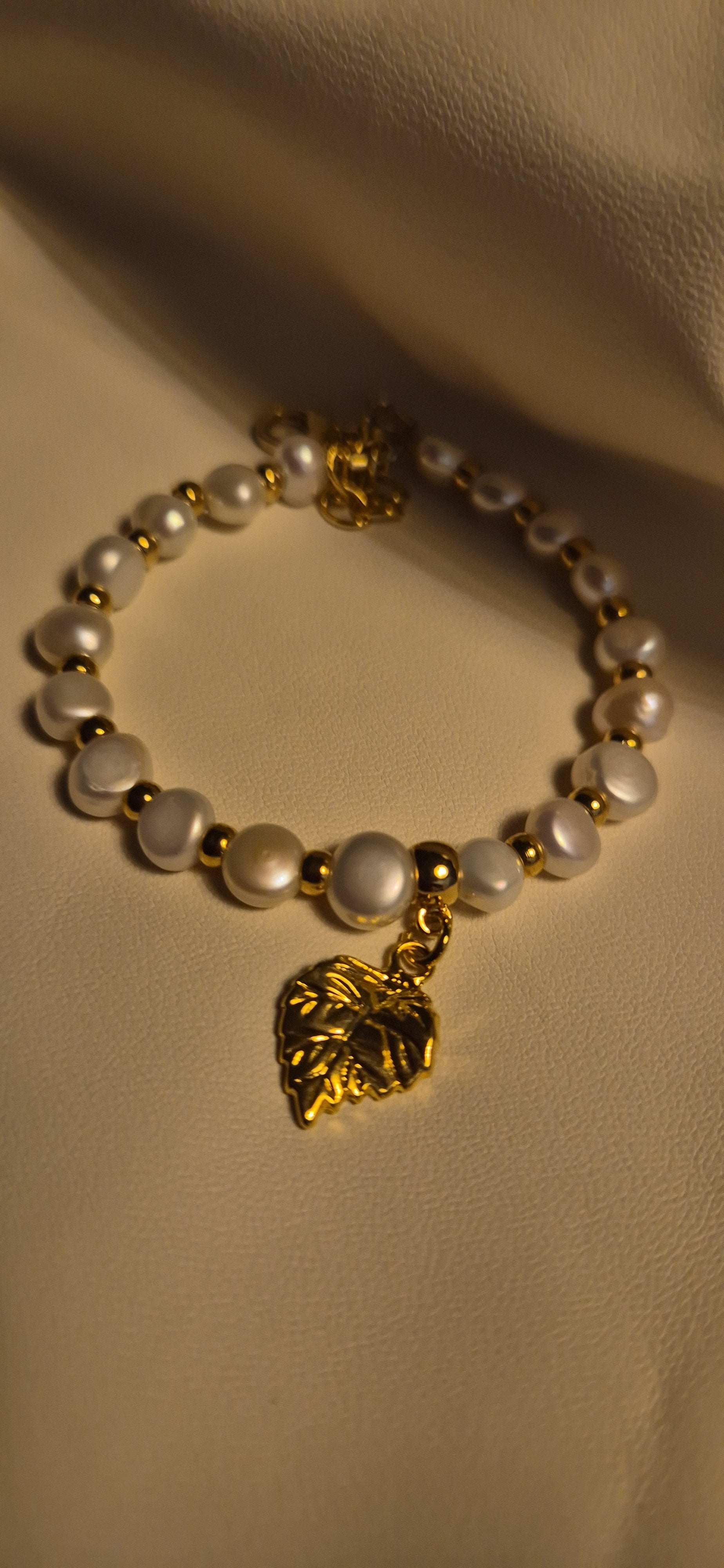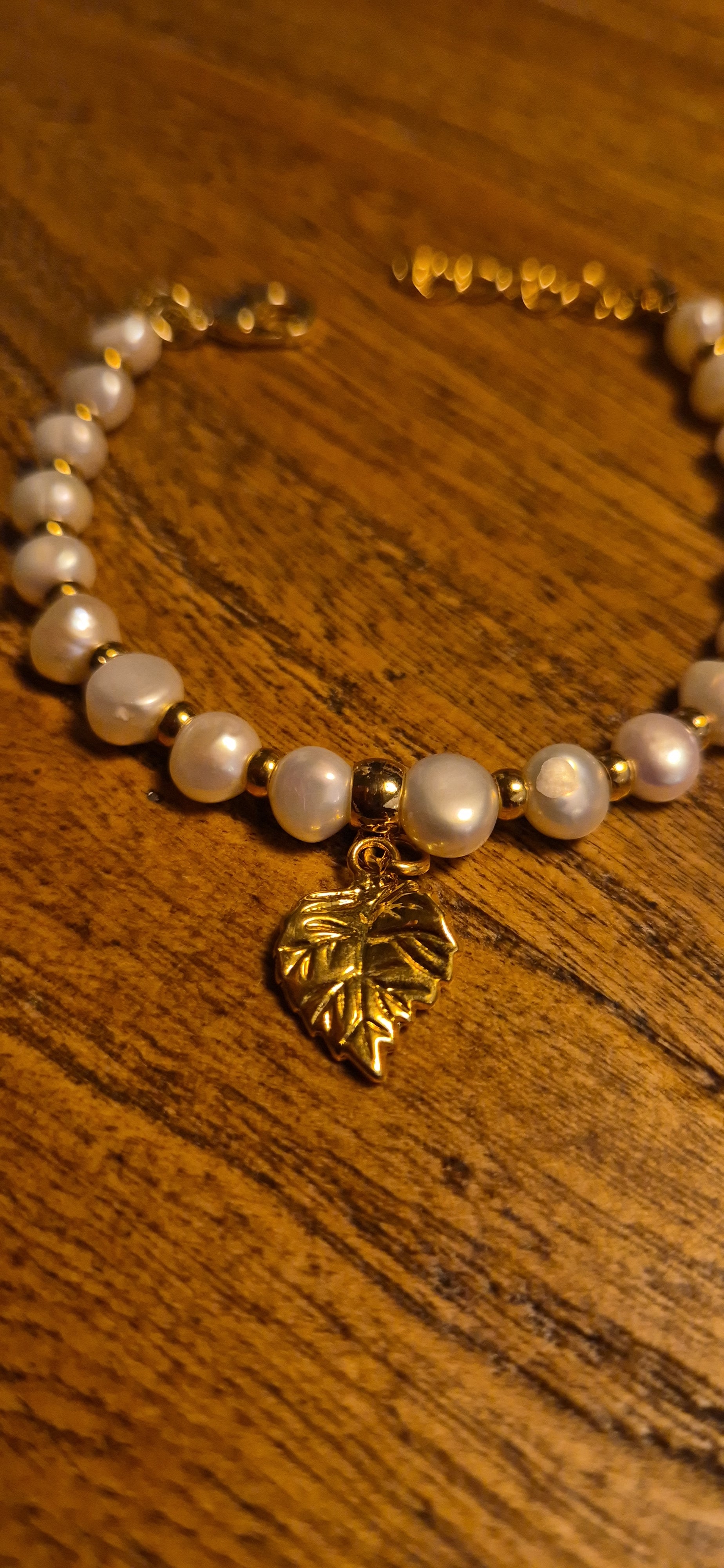 צמיד פנינים טבעיות, מופרדות ע"י חרוזים קטנים, עם צ'ארם עלה, אורך הצמיד 20 ס"מ עם שרשרת הארכה של 4 ס"מ, ציפוי זהב