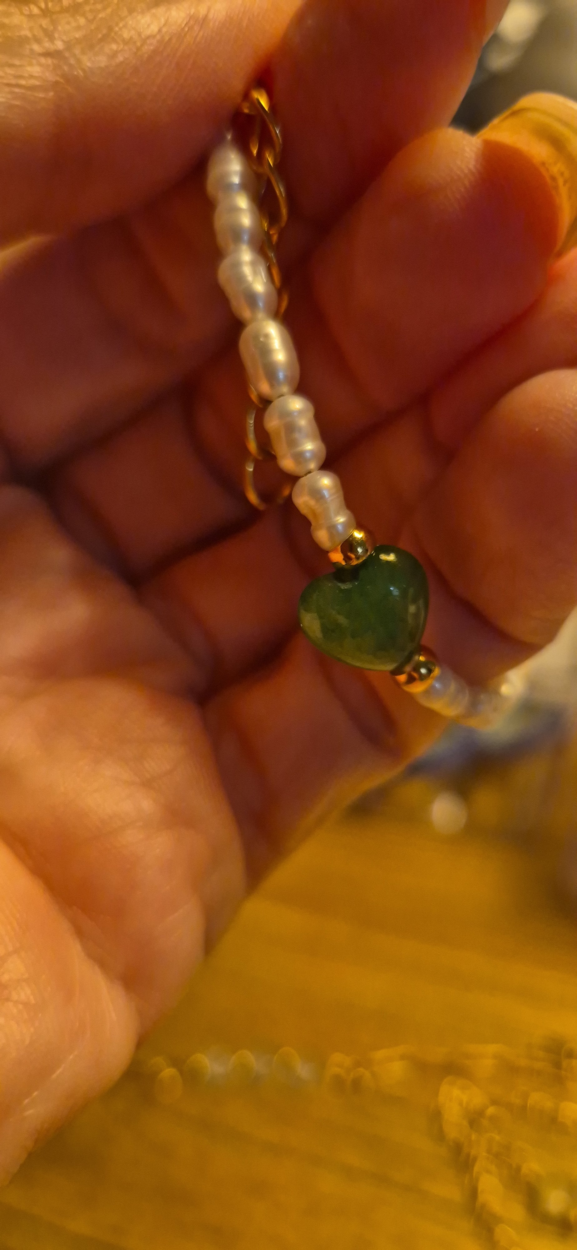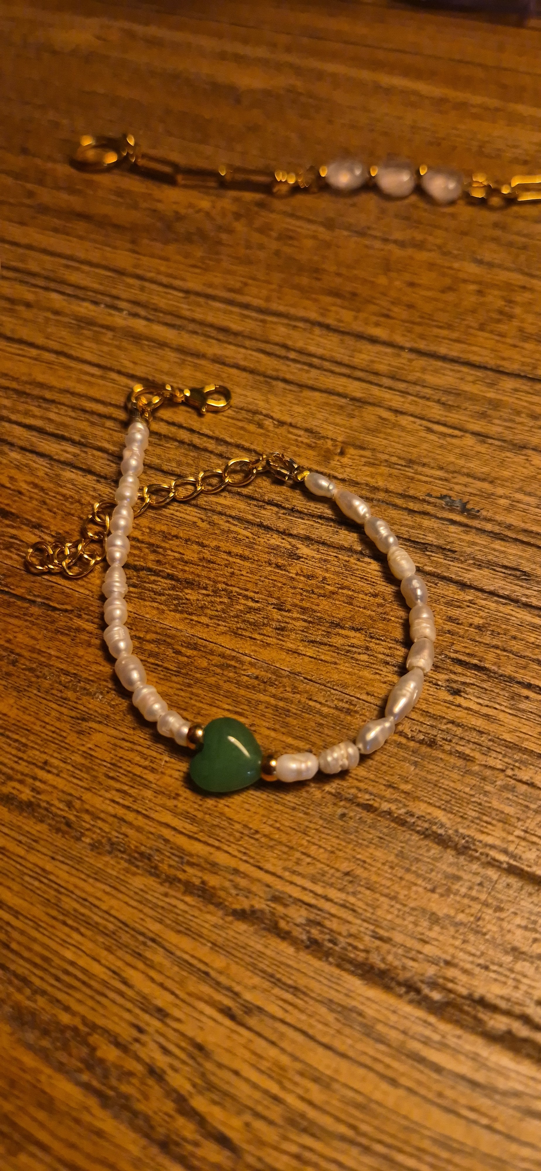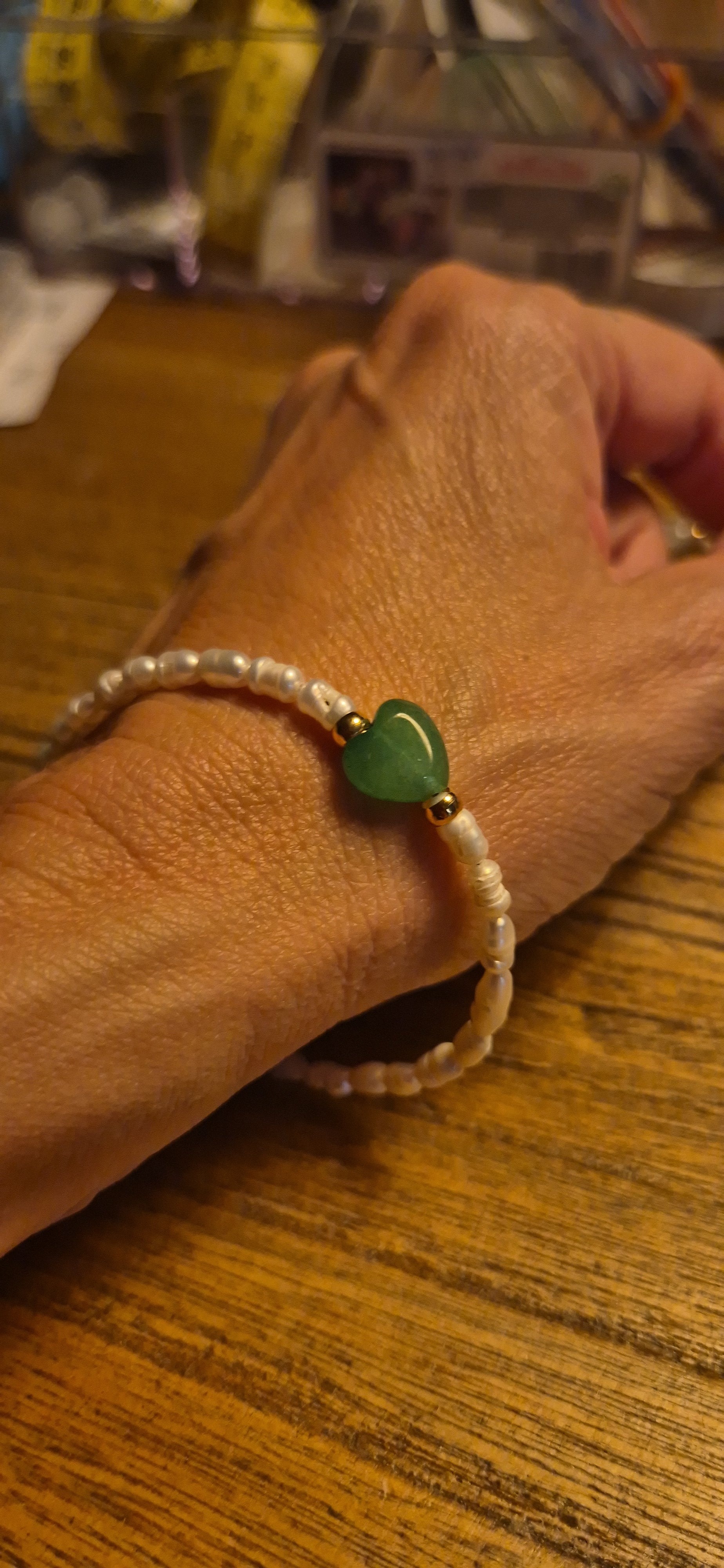 צמיד פנינים טבעיות קטנות לבנות, עם אבן קווארץ לב ירוק
