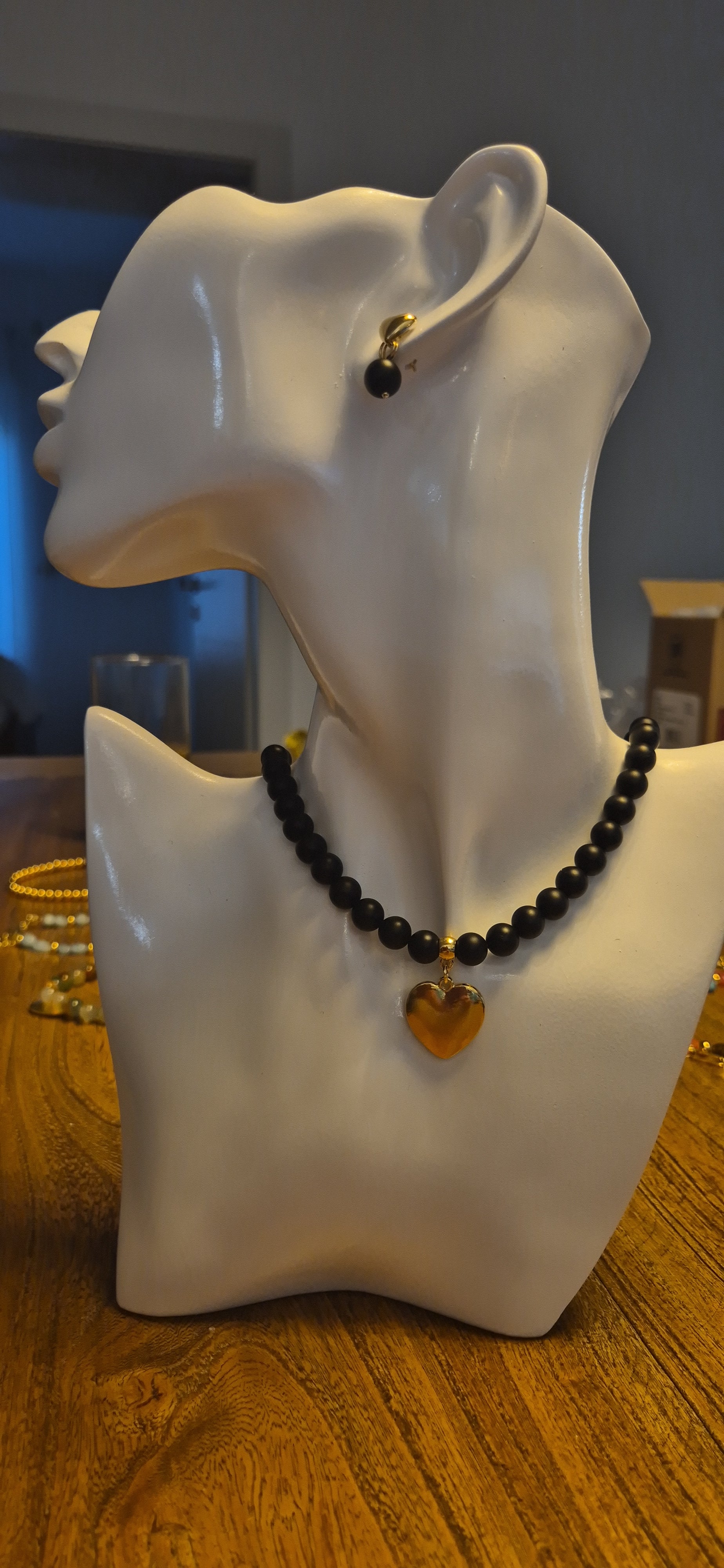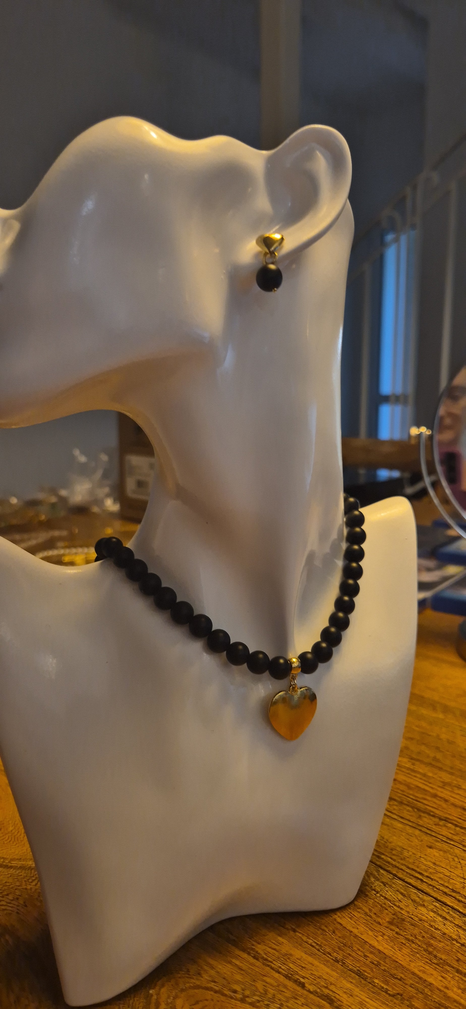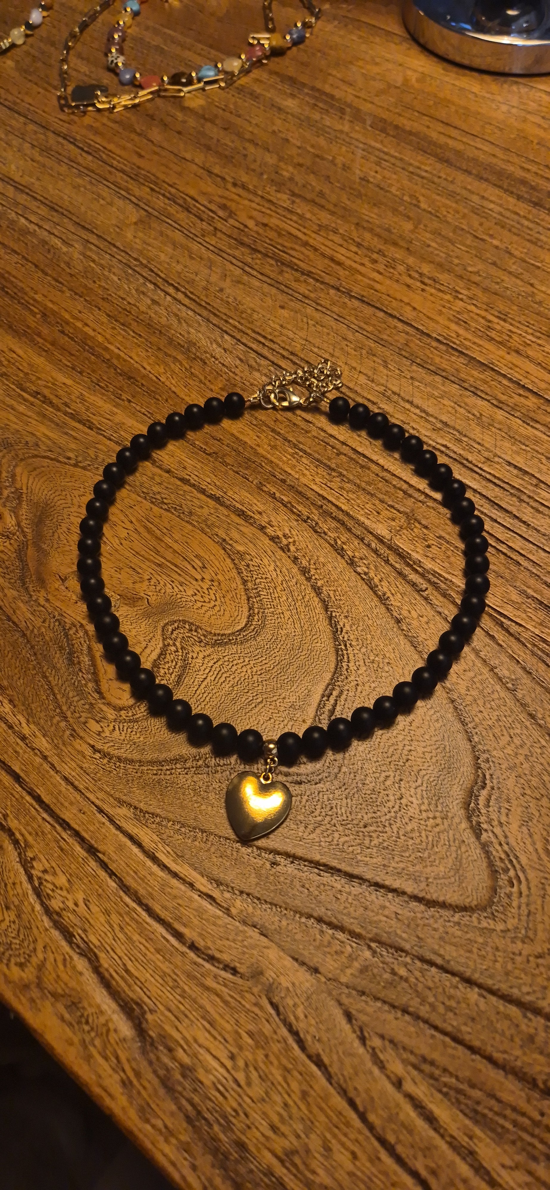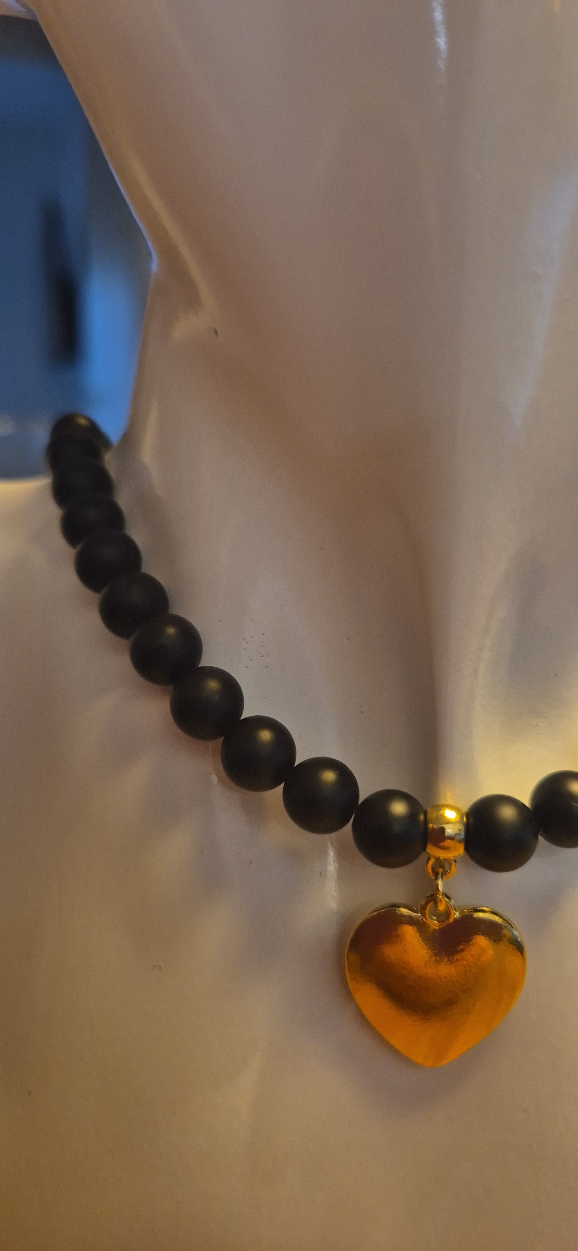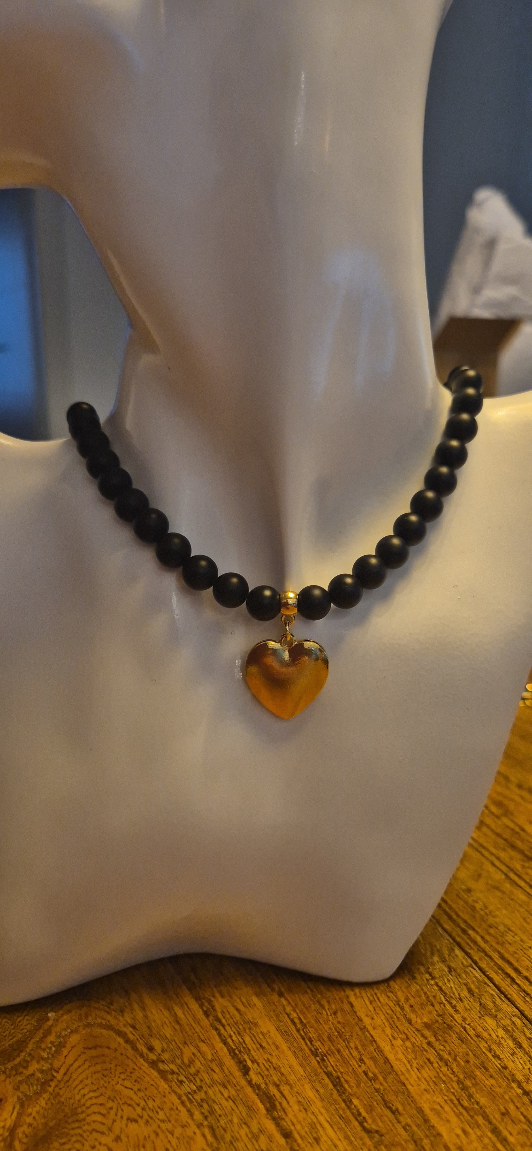 שרשרת חרוזי אבני אגת עגולות שחורות 8 מ"מ עם תליון לב גדול בציפוי זהב, אורך השרשרת 43 ס"מ עם תוספת הארכה של 10 ס"מ