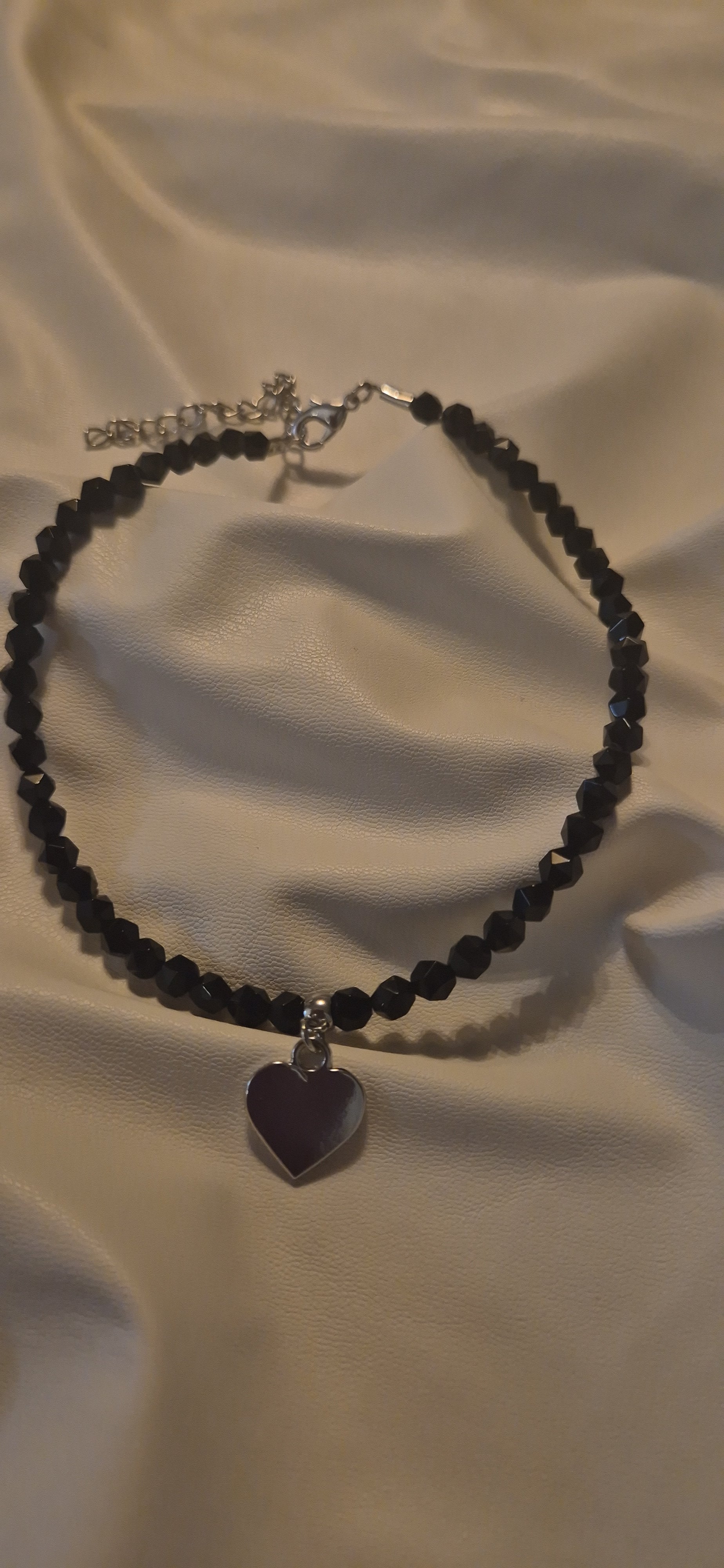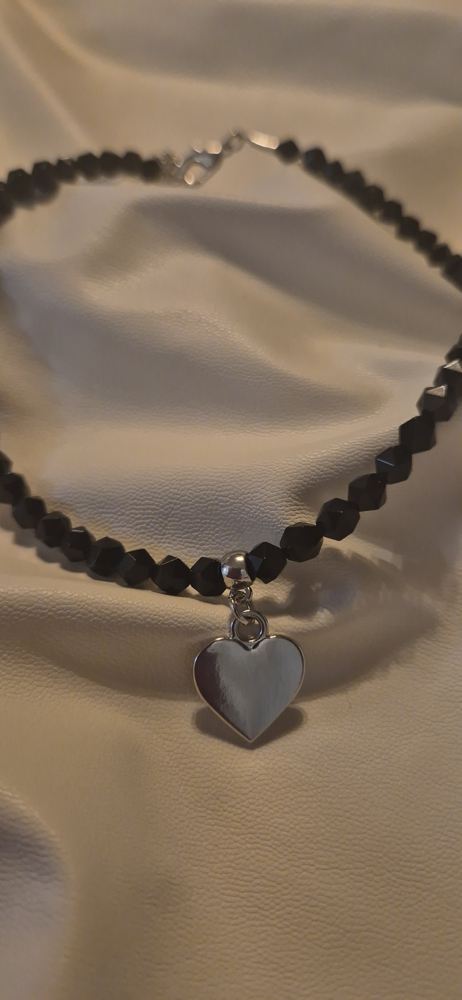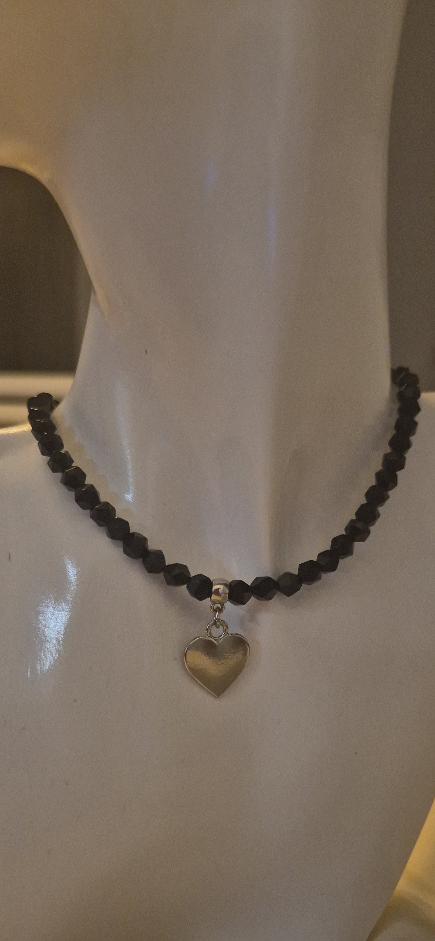 שרשרת חרוזי אבני אגת שחור מבריק בחיתוך כוכב עם ,תליון לב במרכז, צבע כסף