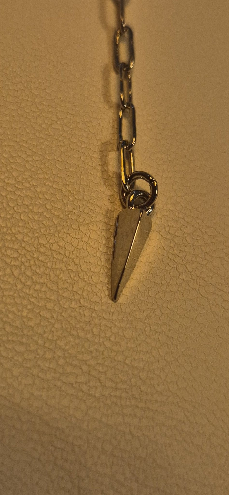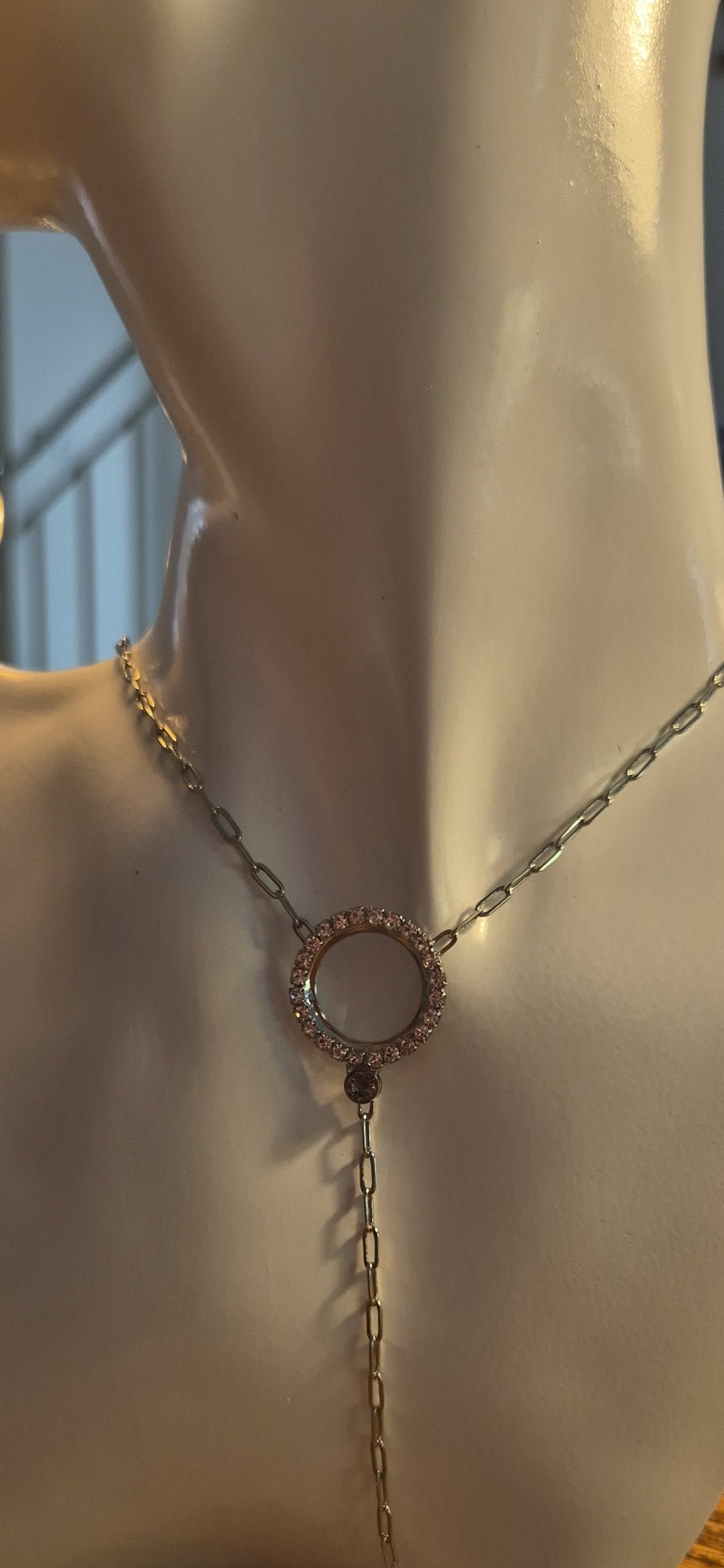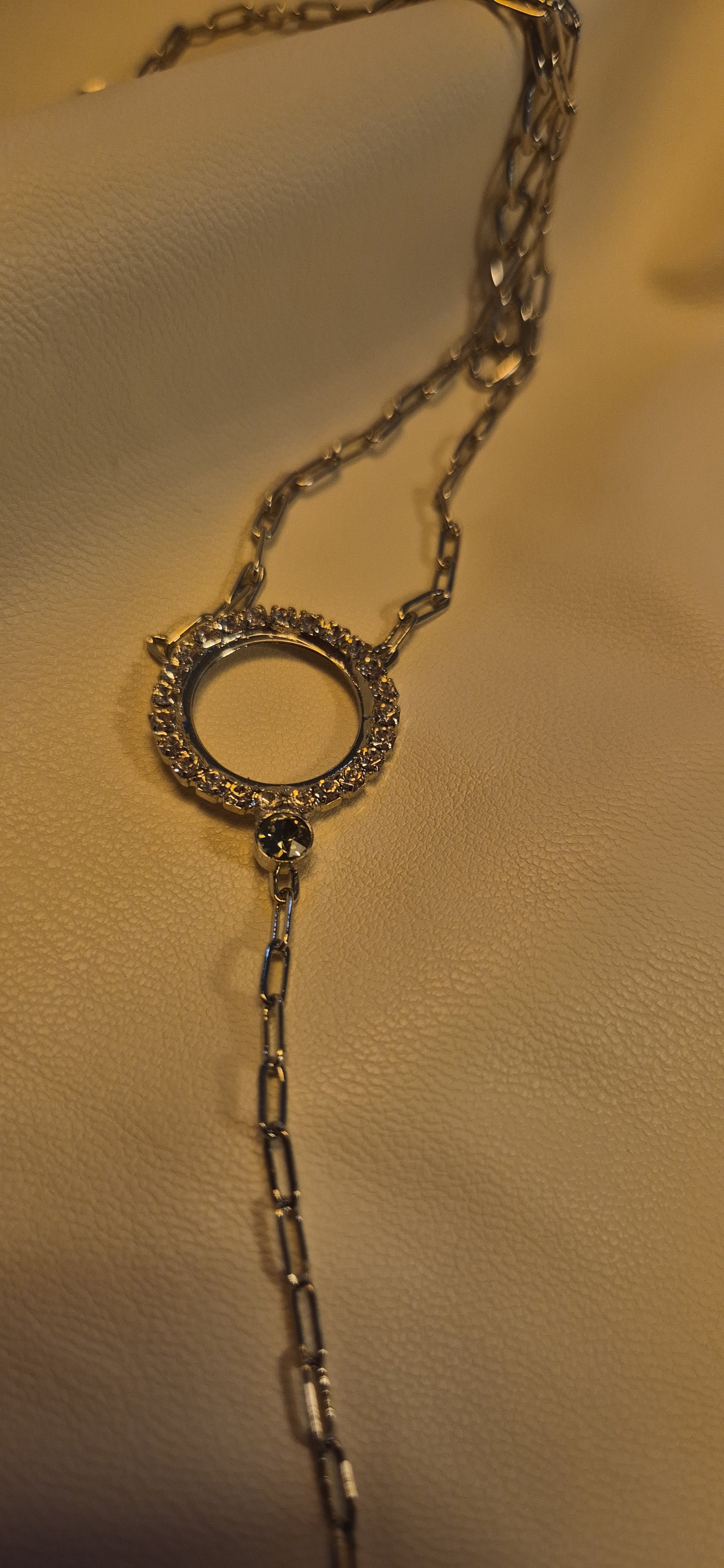 שרשרת עדינה בצבע כסף, עם מעגל זרקונים ועוד אבן קריסטל קטנה שחורה 4 מ"מ וחלק שרשרת נשפך. אורך השרשרת 45 ס"מ, אורך החלק הנשפך 23 ס"מ עם צ'ארם משולש בקצה. לשרשרת תוספת הארכה של 5 ס"מ